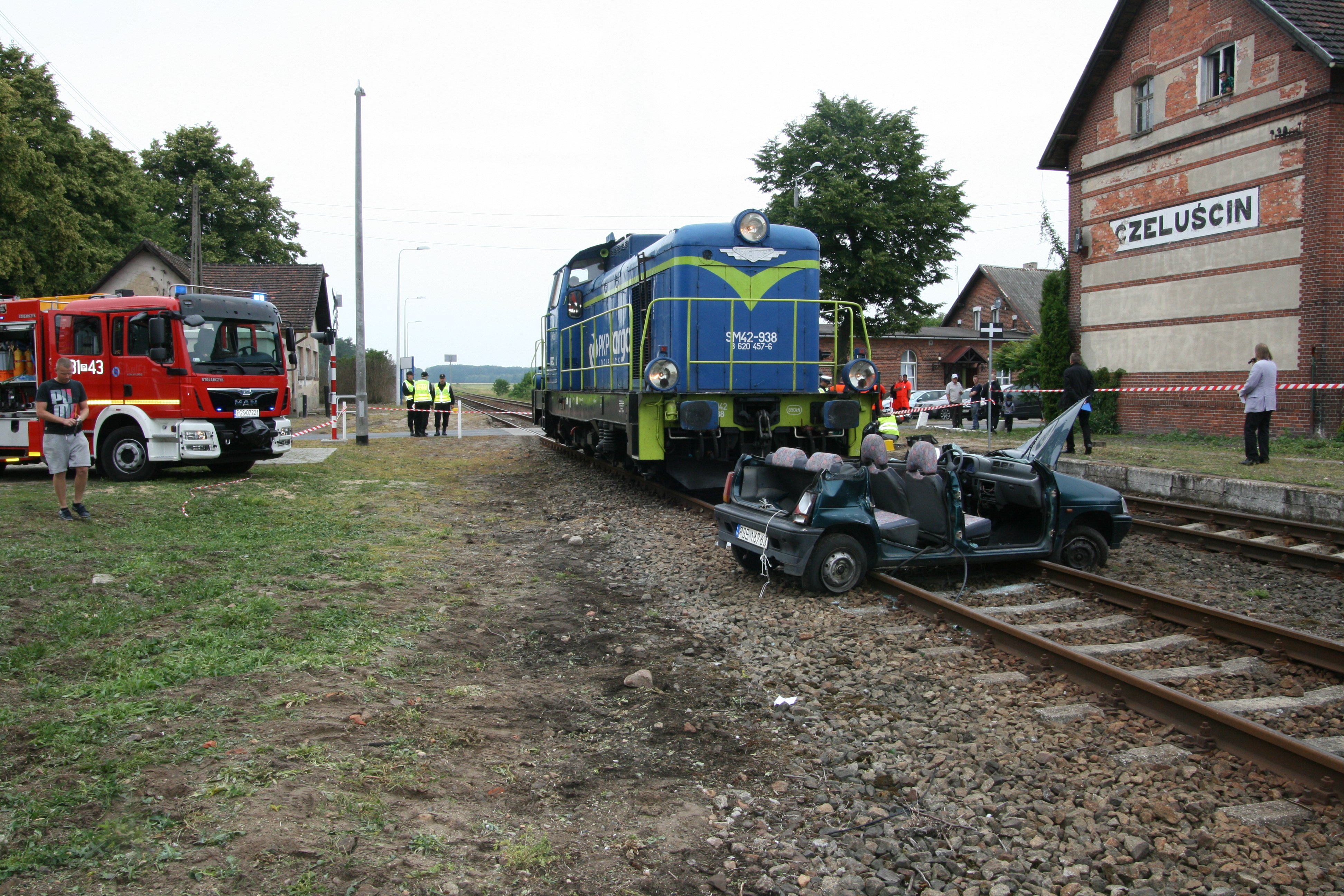 Symulacja zderzenia lokomotywy z samochodem na przejeździe kolejowo-drogowym w miejscowości Czeluścin