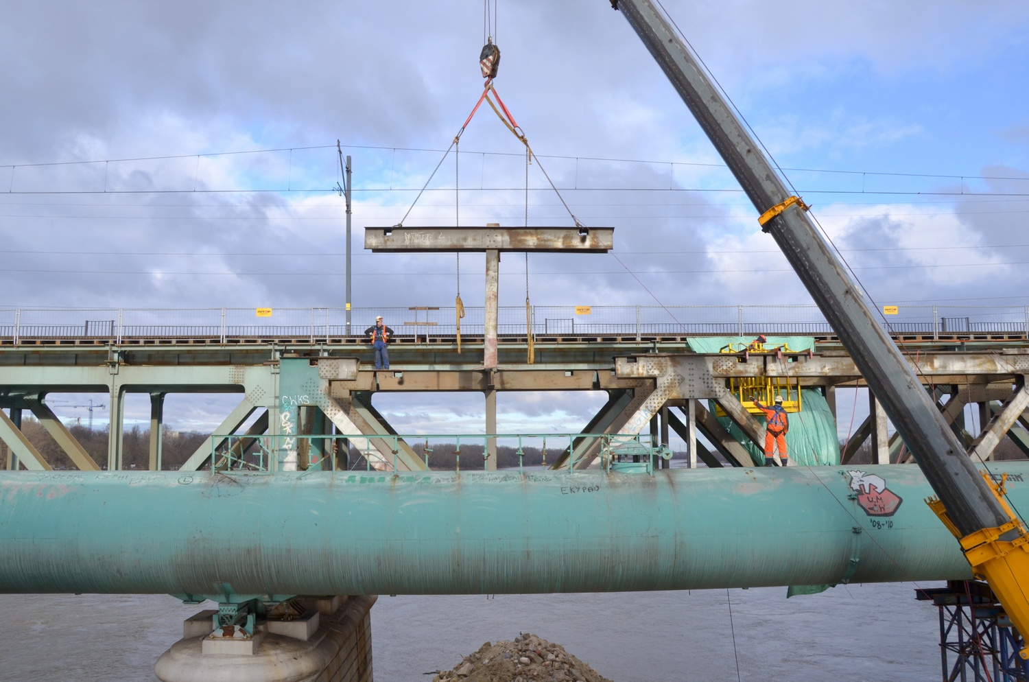 Od strony Żoliborza montowane jest nowe przęsło kolejowego Mostu Gdańskiego, które zostanie osadzone na podporach od strony Pragi. Przy pomocy dźwigów i barek trwają demontaże starych elementów obiektu. Łącznie wymienionych na nowe będzie 9 przęseł. Inwestycja PKP Polskich Linii Kolejowych S.A. warta jest ponad 75 mln zł. Efektem prac będzie sprawniejszy ruch pociągów w Warszawie. Od strony Wisłostrady scalana jest 250-tonowa konstrukcja przęsła, które w marcu zostanie nasunięte na kamienne podpory od strony Pragi. Samo nasuwanie elementu będzie bardzo skomplikowana operacją, która potrwa około 14 dni. Następnie, po kolei, montowane będą kolejne przęsła i dosuwane do siebie. Cały most składa się łącznie z 9 przęseł. 7 z nich waży po 250 ton każde, a 2 skrajne po 60 ton. Wzmacniane są filary i przyczółki. Staną na nich nowe, wytrzymalsze przęsła, na których zamontowane będą tory i siec trakcyjna. Od listopada zeszłego roku trwa demontaż półkilometrowej, południowej konstrukcji kolejowego Mostu Gdańskiego. Mimo zimowej aury i niskich temperatur wykonawca utrzymuje dobre tempo prac. Do połowy lutego rozebranych zostało 6 z 9 przęseł. Wykonany został specjalny pomost montażowy, który posłuży do przesuwania nowych przęseł na docelowe miejsce. Przy wykonywaniu najcięższych prac wykorzystywane są barki i ciężkie dźwigi, za pomocą których zdejmowane są ciężkie stalowe elementy. Remont nie ma wpływu na ruch pociągów. W sierpniu 2019 r., po zakończeniu prac i uzyskaniu wszystkich zgód administracyjnych, odnowiona ponad 500-metrowa południowa nitka Mostu Gdańskiego będzie dostosowana do przejazdu pociągów pasażerskich z prędkością 120 km/h. Składy towarowe będą mogły jechać z 100 km/h. Zwiększy się przepustowość linii obwodowej. Inwestycja PKP Polskich Linii Kolejowych S.A. za ponad 75 mln zł realizowana ze środków budżetowych.