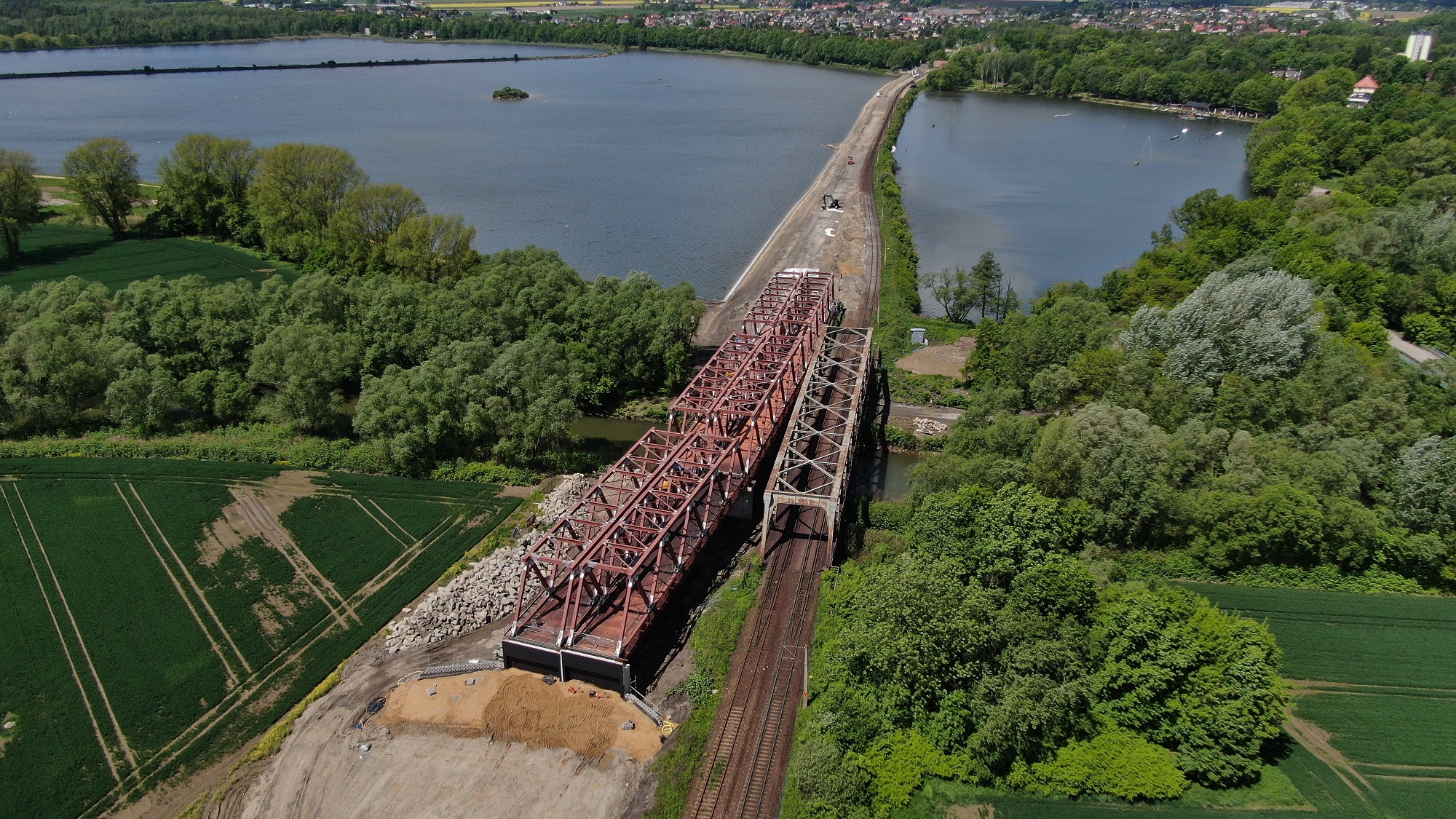 PLK-2021-06-18-Kolej-zwieksza-mozliwosci-przewozow-przez-Czechowice-Dziedzice-Most-na-Wisle-w-Goczalkowicach-Zdroj-z-lotu-ptaka-widac-nowy-i-stary-obiekt-maszyny-w-tle-stawy-po-dwoch-stonach-toru-i-przystanek-fot.jpg
