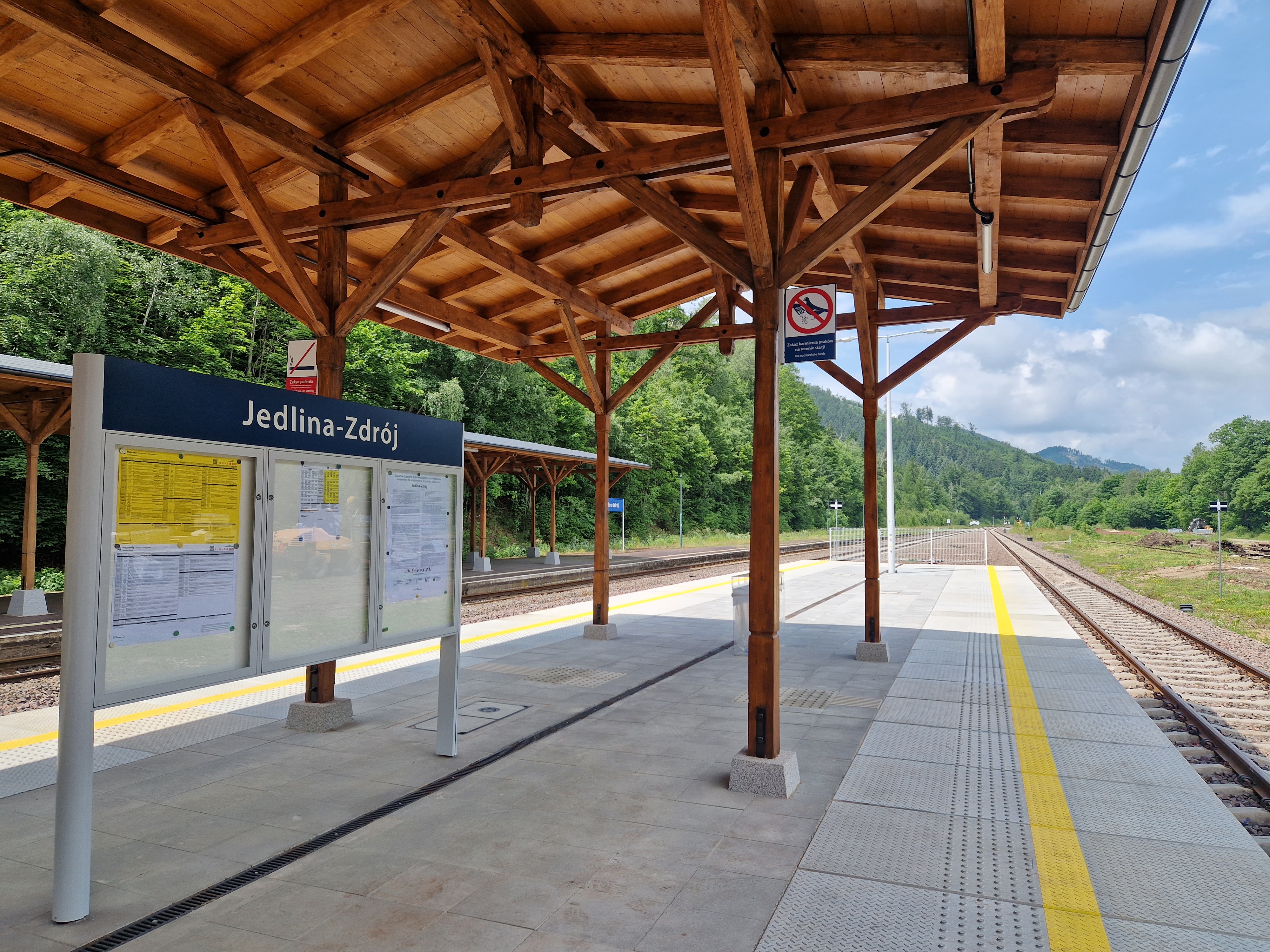 PLK-2023-06-23-Dolny-Slask-znow-pojedziemy-pociagiem-miedzy-Swidnica-a-Jedlina-Zdrojem-Stacja-Jedlina-Zdroj-widok-na-peron-wiate-i-gablote-informacyjna-fot.jpg