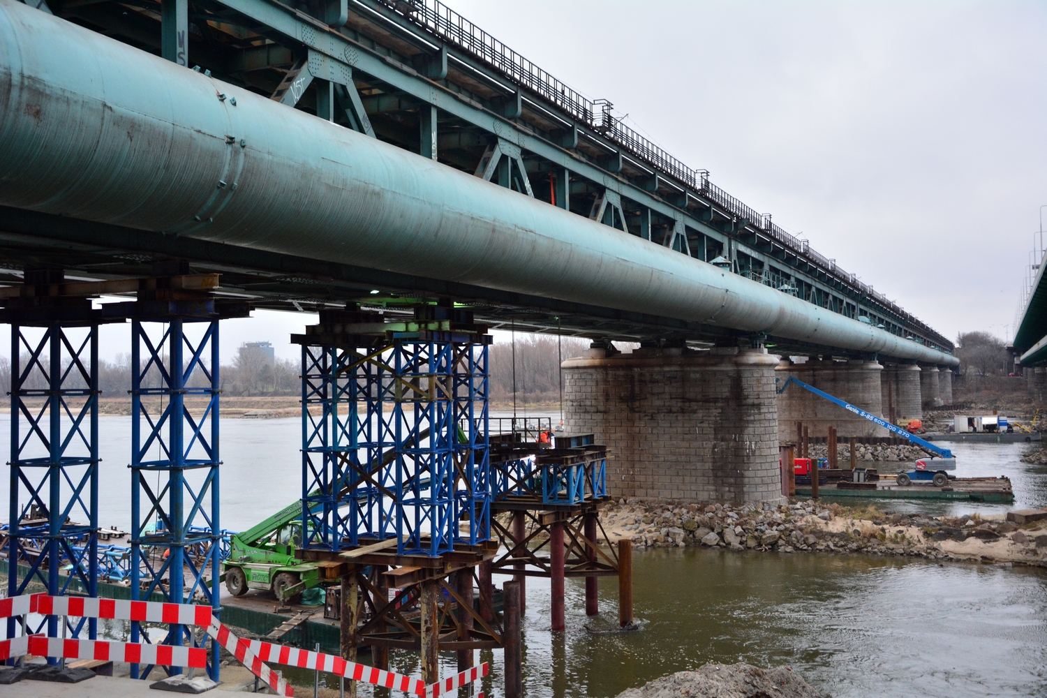 Barki, dźwigi i rusztowania pomagają zdjąć i przetransportować dziewięć przęseł Mostu Gdańskiego na praski brzeg. Wykonawca zdjął już tory i sieć trakcyjną. Stare konstrukcje zastąpione zostaną nowymi, przystosowanymi do cięższych pociągów i wyższych prędkości. Efektem prac będzie sprawniejszy ruch pociągów w Warszawie. Inwestycja PKP Polskich Linii Kolejowych S.A. warta jest ponad 75 mln zł.