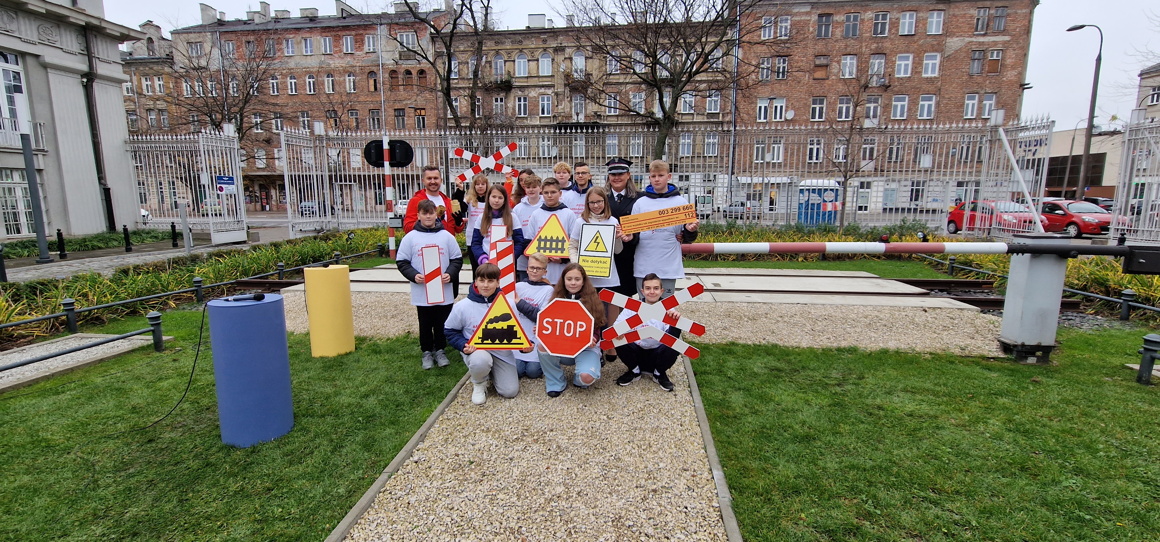 bezpieczny przejazd, bezpieczeństwo, centrala, przejazd kolejowo-drogowy, znak, żółta naklejka, napęd rogatkowy, edukacja, edukacja dzieci, dzieci, dziecko, rogatka, wydarzenie plenerowe, prelekcja, Kuniszewicz Patryk, koordynator kampanii, lekcja plenerowa, Smolińska Anna, szkoła podstawowa, nauka