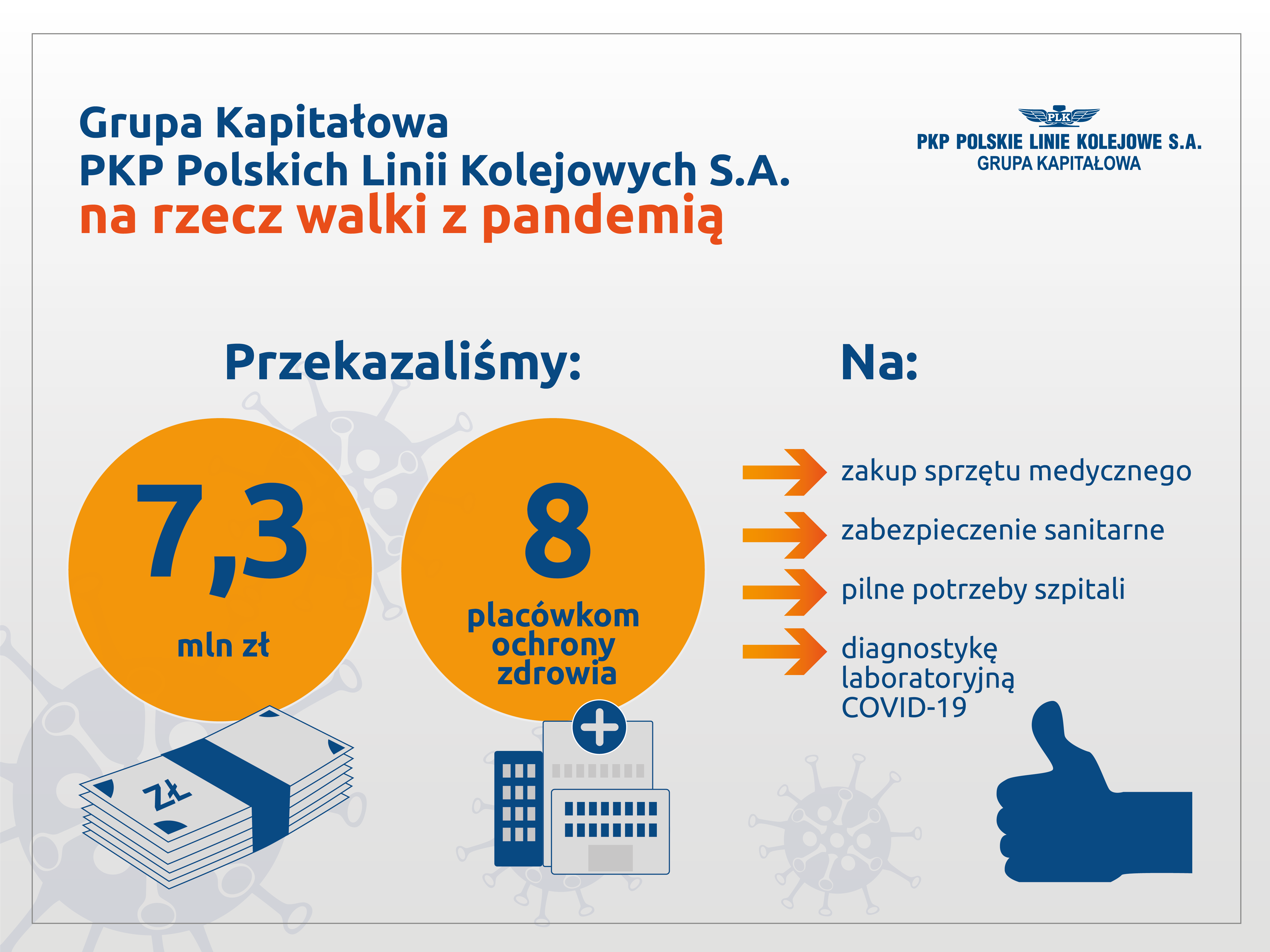 PKP Polskie Linie Kolejowe S.A. oraz spółki zależne PPMT i ZRK–DOM przekazały ponad 2 mln zł dla Samodzielnego Publicznego Zespołu Zakładów Opieki Zdrowotnej w Sierpcu na wsparcie walki z koronawirusem. Łącznie Grupa Kapitałowa PKP Polskich Linii Kolejowych S.A. skierowała ponad 7,3 mln zł na zakup niezbędnego sprzętu medycznego, środków zabezpieczenia sanitarnego oraz pilne potrzeby szpitali.