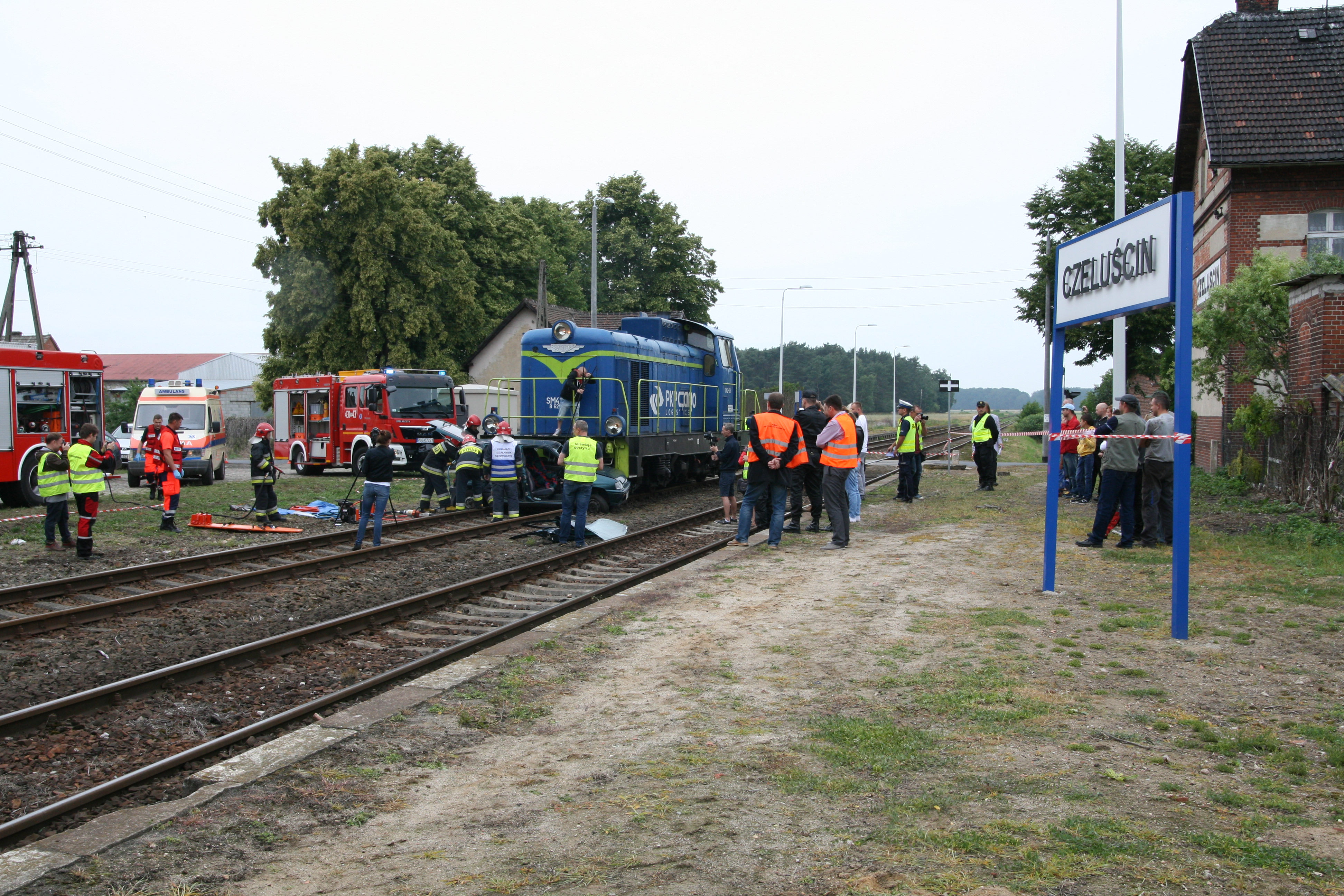 Symulacja zderzenia lokomotywy z samochodem na przejeździe kolejowo-drogowym w miejscowości Czeluścin