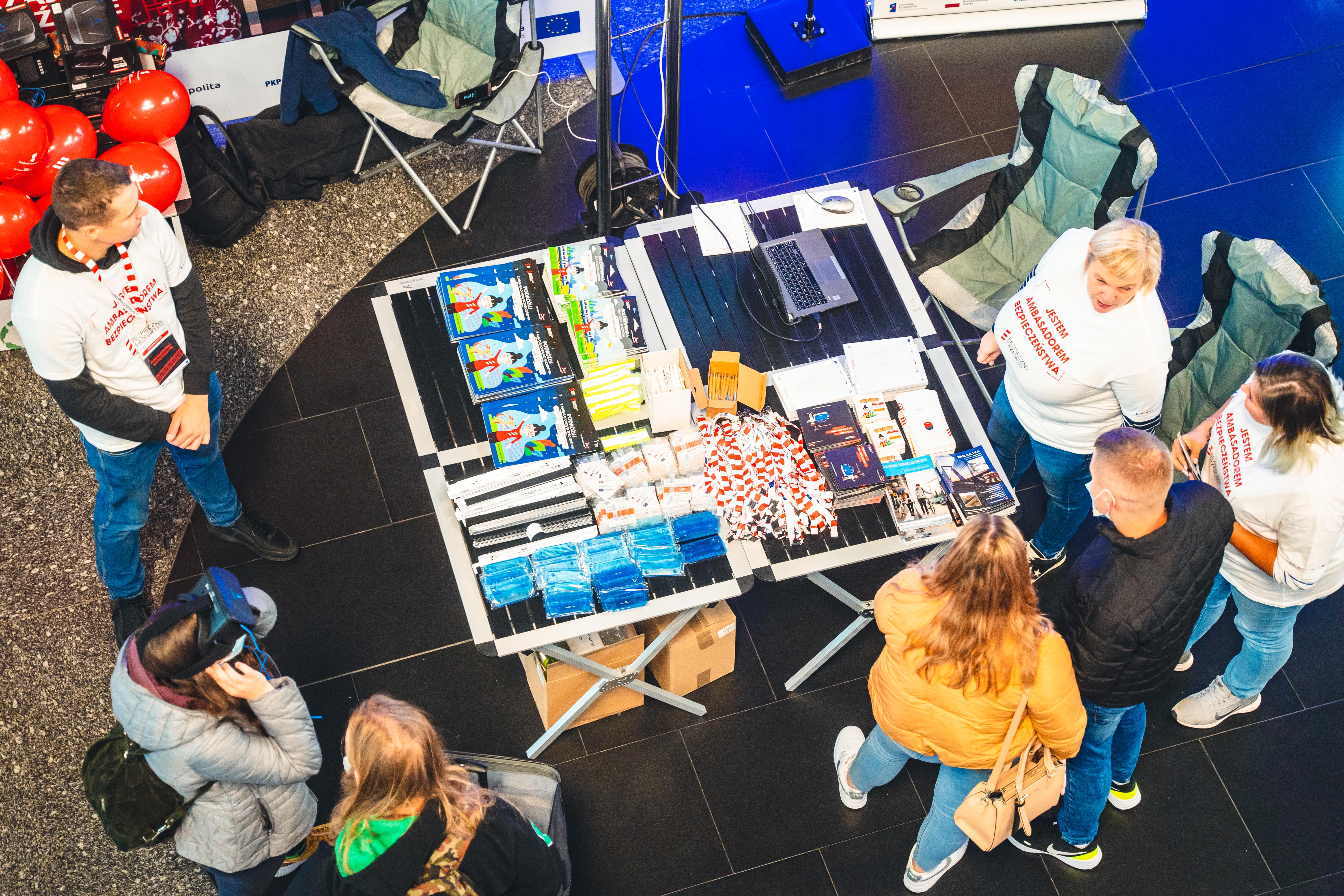 Stoisko kampanii społecznej "Bezpieczny Przejazd" w trakcie przejazdu pociągu europejskiego (Connecting Europe Express) na stacji Warszawa Centralna.