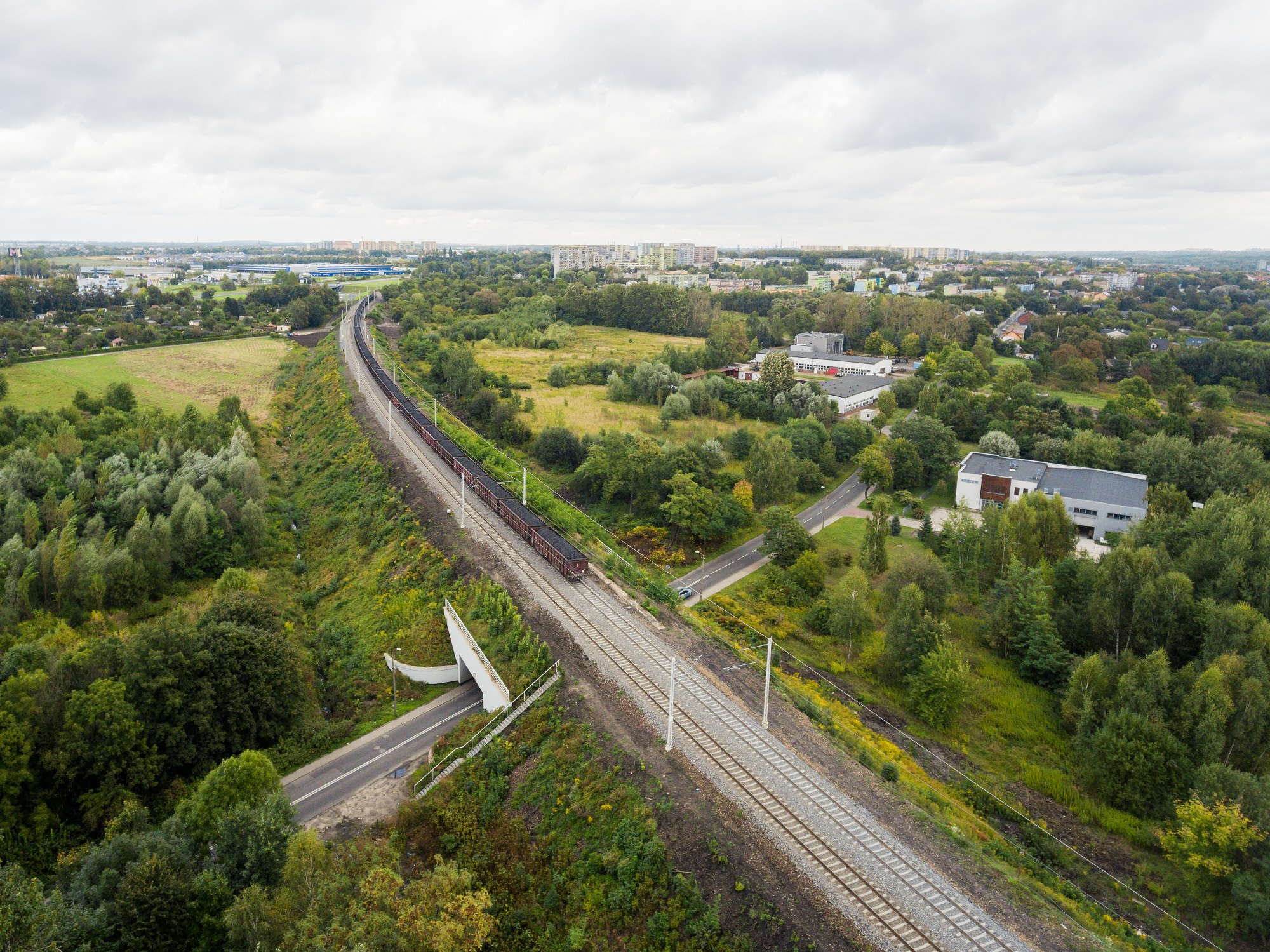 PLK-2022-07-12-Po-mostach-i-wiaduktach-sprawny-i-bezpieczny-przewoz-towarow-koleja-w-GOP-Pociag-na-nowych-torach-na-szlaku-Zabrze-Biskupice-Maciejow-Polnocny-widok-z-lotu-ptaka-fot.jpg