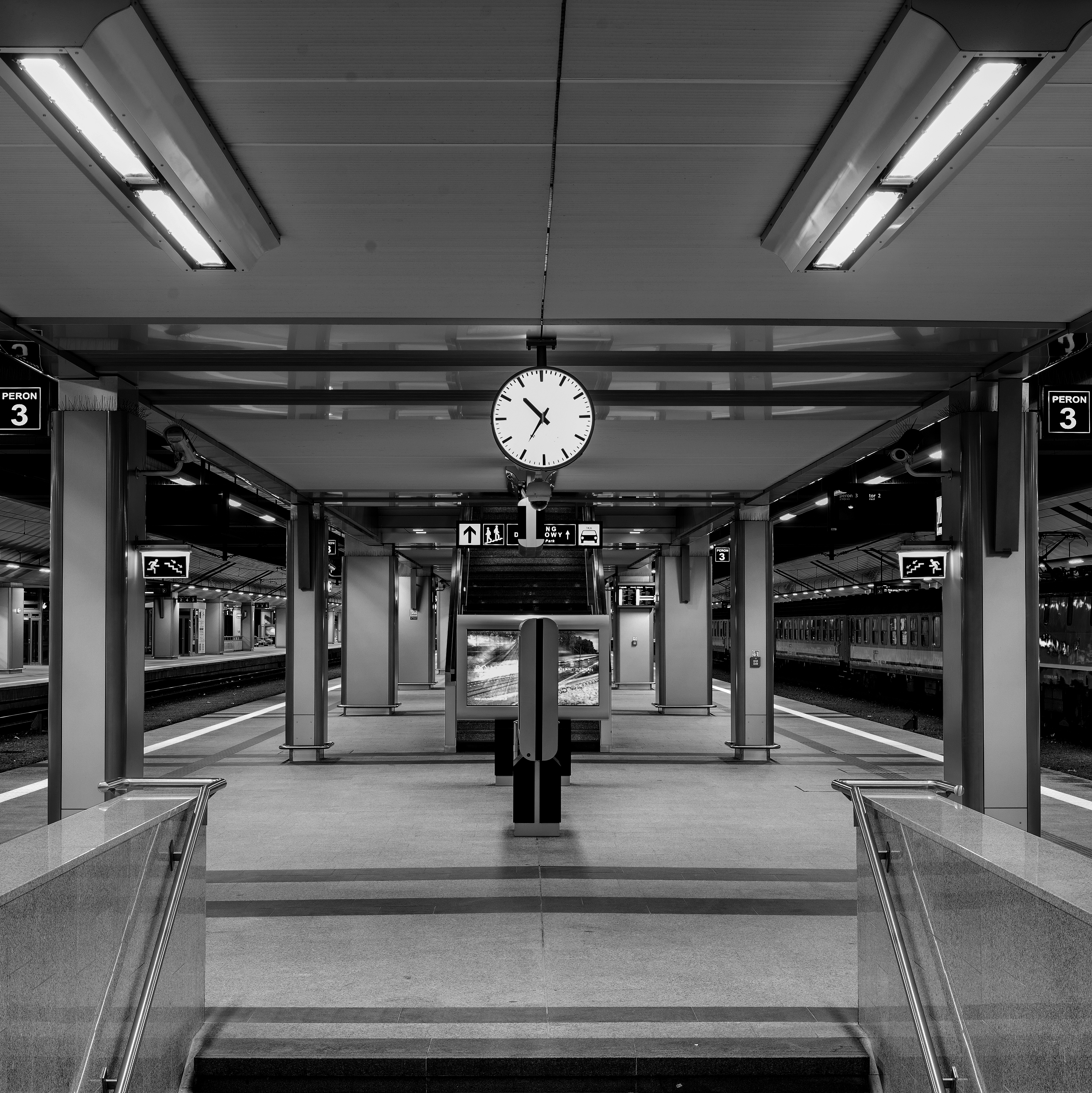 dworzec, peron, Kraków, dworzec kolejowy, noc, Kraków Główny, zegar, schody, infrastruktura kolejowa