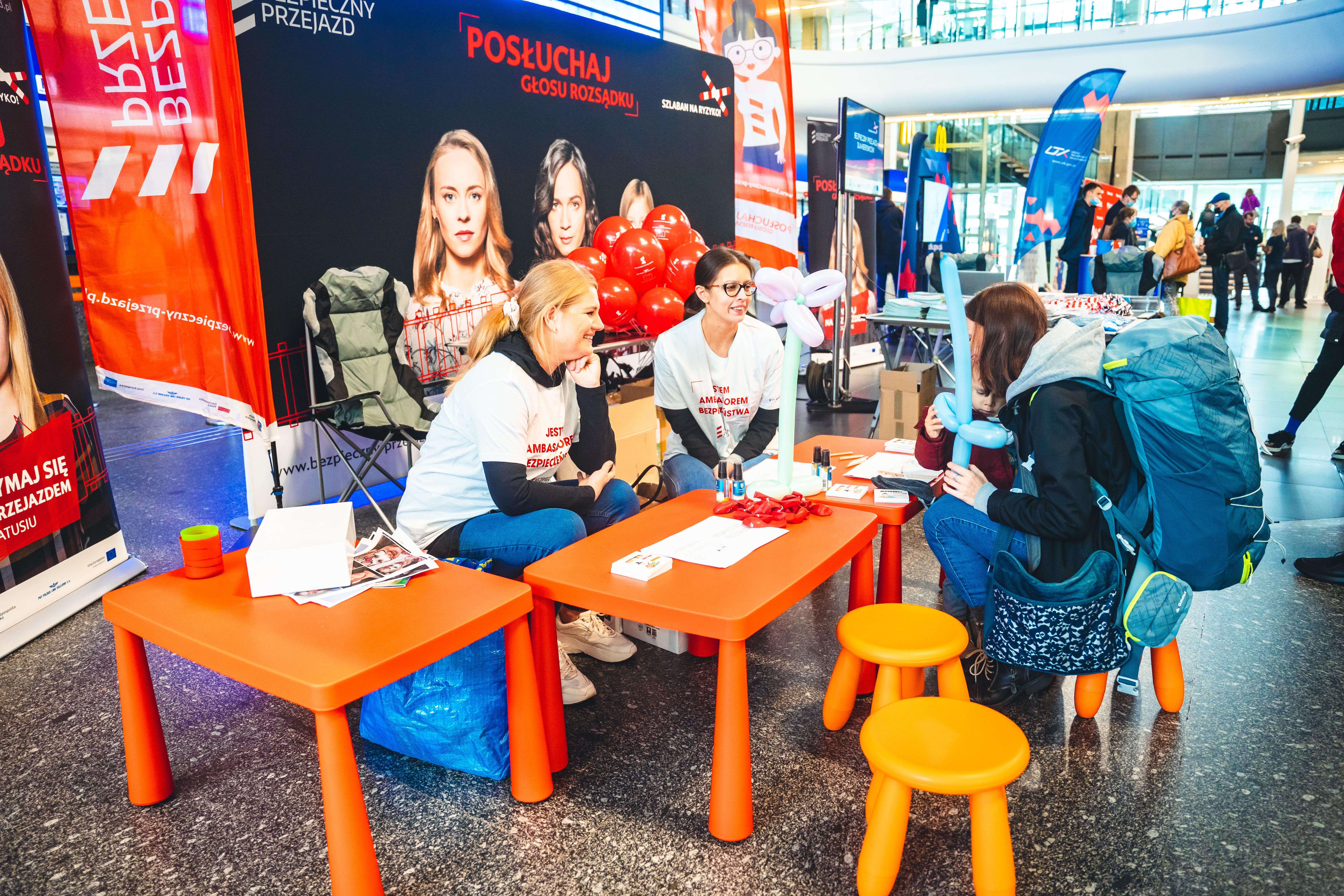 Stoisko kampanii społecznej "Bezpieczny Przejazd" w trakcie przejazdu pociągu europejskiego (Connecting Europe Express) na stacji Warszawa Centralna.