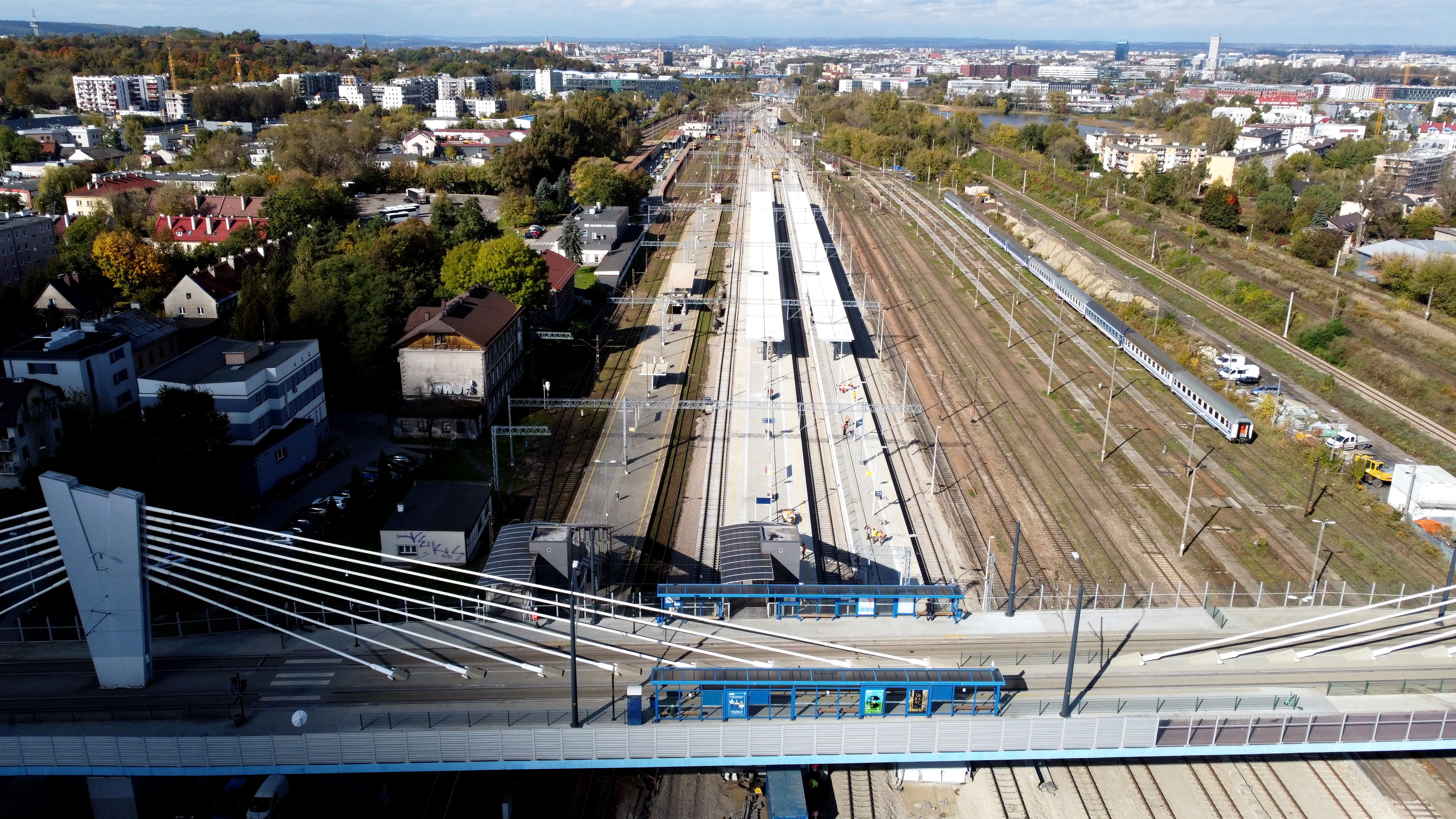 PLK-2021-10-15-Krakow-Plaszow-podrozni-wygodniej-wsiadaja-do-pociagow-Widok-z-lotu-ptaka-na-estakade-tramwajowa-i-stacje-Krakow-Plaszow-fot.jpg