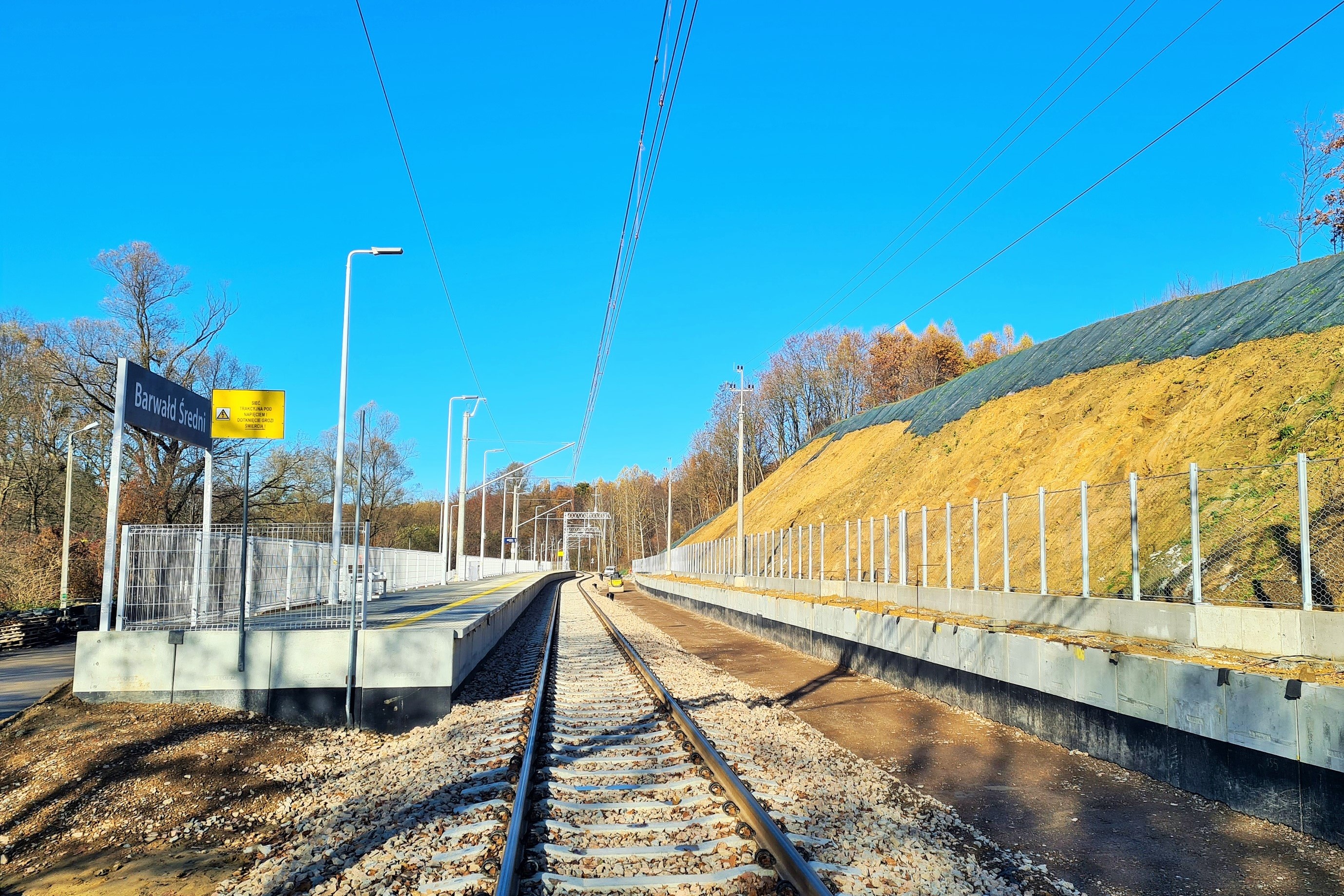 PLK-2021-11-04-Pociagi-wracaja-na-trase-Krakow-Bonarka-Bielsko-Biala-Barwald-Sredni-nowy-peron-przy-zmodernizowanym-torze-tablica-z-nazwa-przystanku-fot.jpg