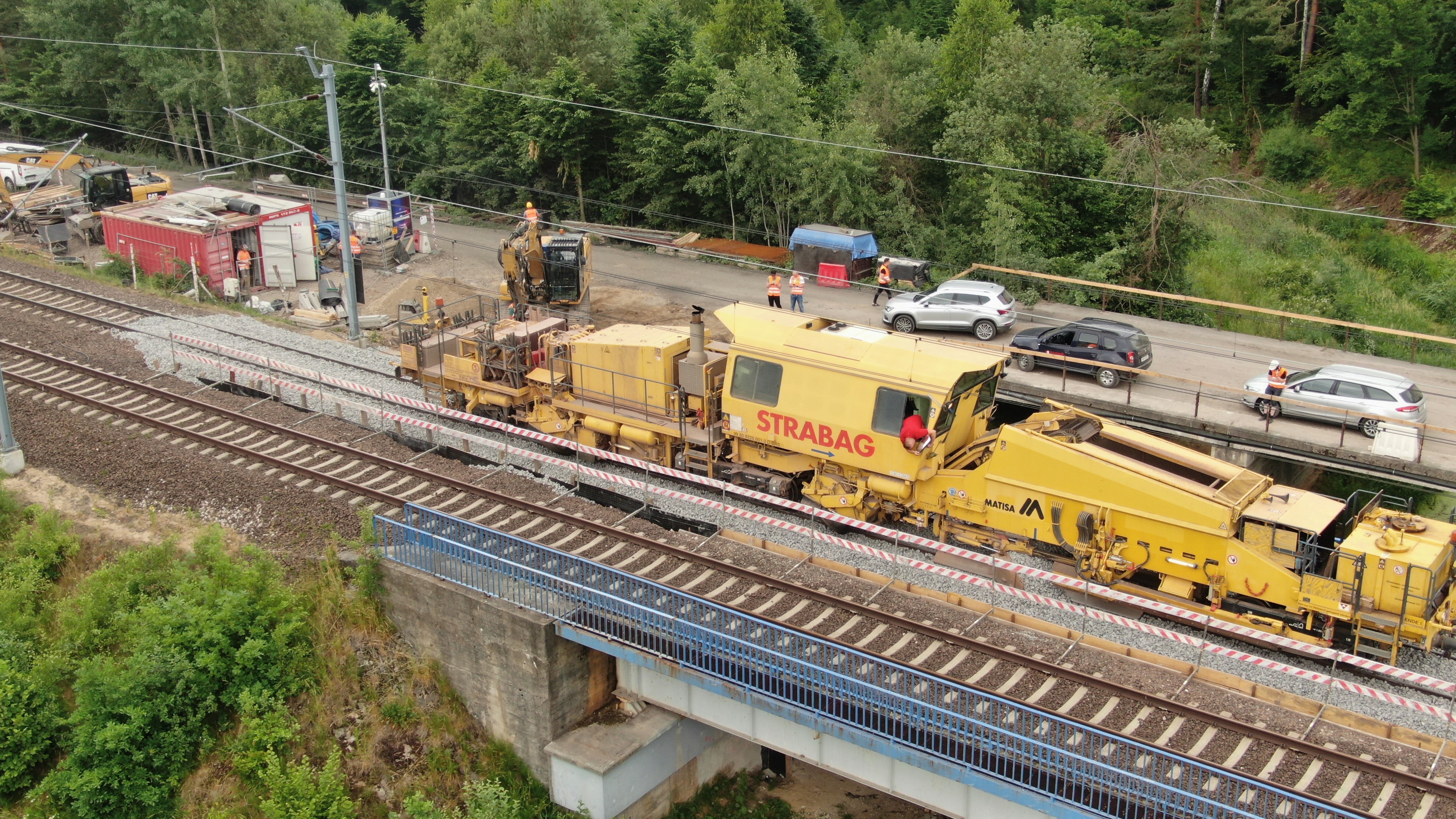 PLK-2021-07-02-Nowe-wiadukty-i-mosty-na-CMK-po-testach-stutonowych-lokomotyw-podbijarka-torowa-pracuje-na-moscie-kolejowym-na-CMK-widok-z-gory-fot.jpg
