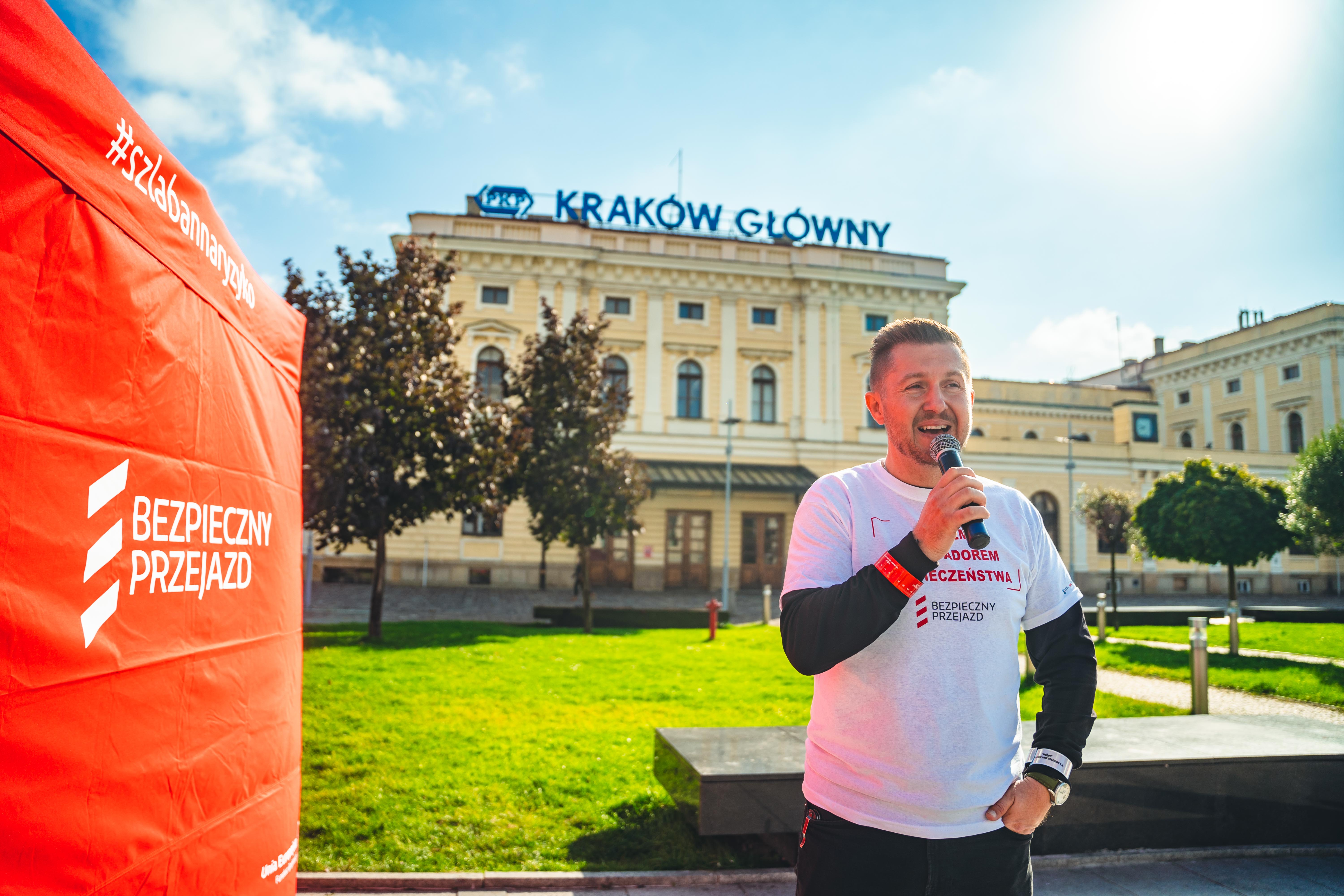 Stoisko kampanii społecznej "Bezpieczny Przejazd" w trakcie przejazdu pociągu europejskiego (Connecting Europe Express) na stacji Kraków Główny.