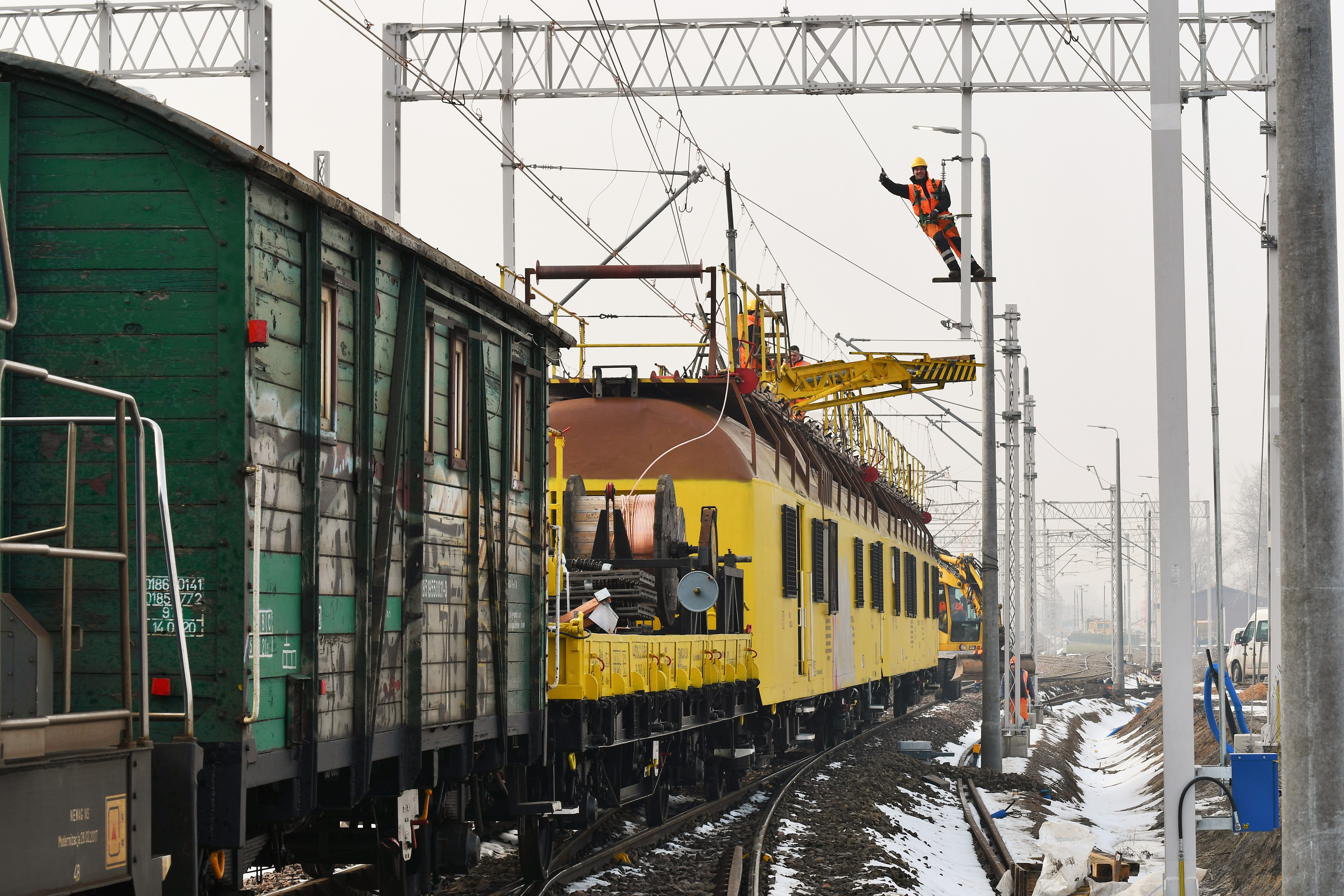 Postęp prac przy odbudowie Warszawy Głównej. Montaż sieci trakcyjnej. Budowa wejścia na kładkę od strony dzielnicy Ochota.