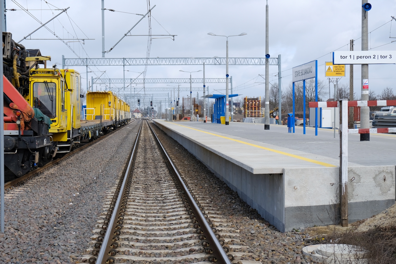 Nowe wiaty chronią już podróżnych na przebudowywanym peronie w Kościanie. Na stacji widać coraz więcej efektów prac. Modernizacja linii E59 z Poznania do Wrocławia postępuje też na pozostałych odcinkach. Inwestycja PKP Polskich Linii Kolejowych S.A. za ponad 1,5 mld zł potrwa do końca 2020r. Szklane zadaszenie na peronie nr 2 w Kościanie podtrzymują stalowe podpory. Dla podróżnych stanęły dwie 80 m wiaty. Dostępna jest już jedna część platformy. Trwa wykończenie drugiej. Wkrótce zacznie się układanie kostki peronowej i montaż małej architektury. Podwyższony do 76 cm peron z antypoślizgową nawierzchnią, energooszczędnym oświetleniem LED i nowoczesnym systemem informacji zapewni lepszy komfort podróży.