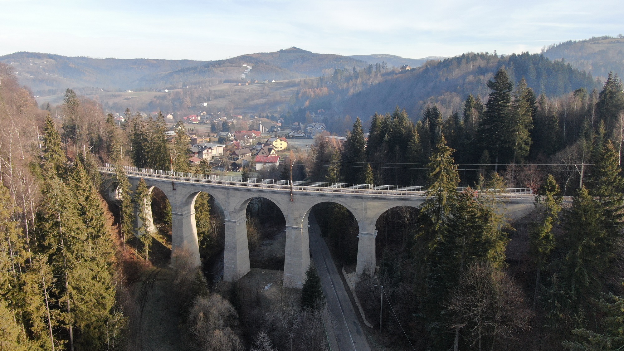 PLK-2022-12-07-Pociagiem-do-Wisly-i-w-Beskid-Slaski-od-11-grudnia-Wiadukt-kolejowy-w-Wisle-Glebce-widziany-z-lotu-ptaka-na-wiadukcie-tor-i-siec-trakcyjna-fot.jpg