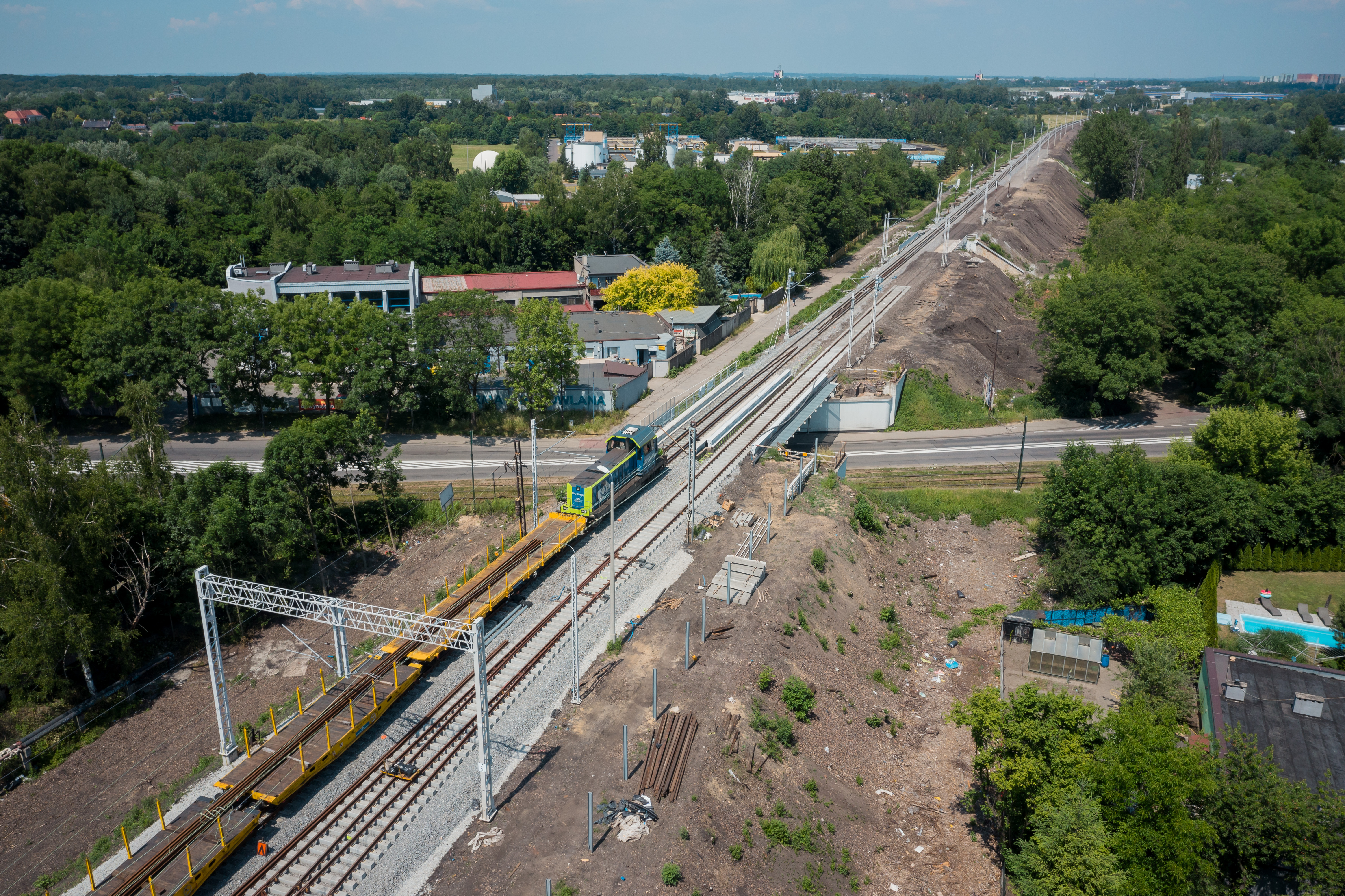 PLK-2021-06-23-Coraz-lepszy-przewoz-towarow-po-torach-w-GOP-Pociag-towarowy-przejezdza-nowym-torem-na-odcinku-Zabrze-Biskupice-Maciejow-Pln-obok-ukladany-tor-widok-z-gory-fot.jpg