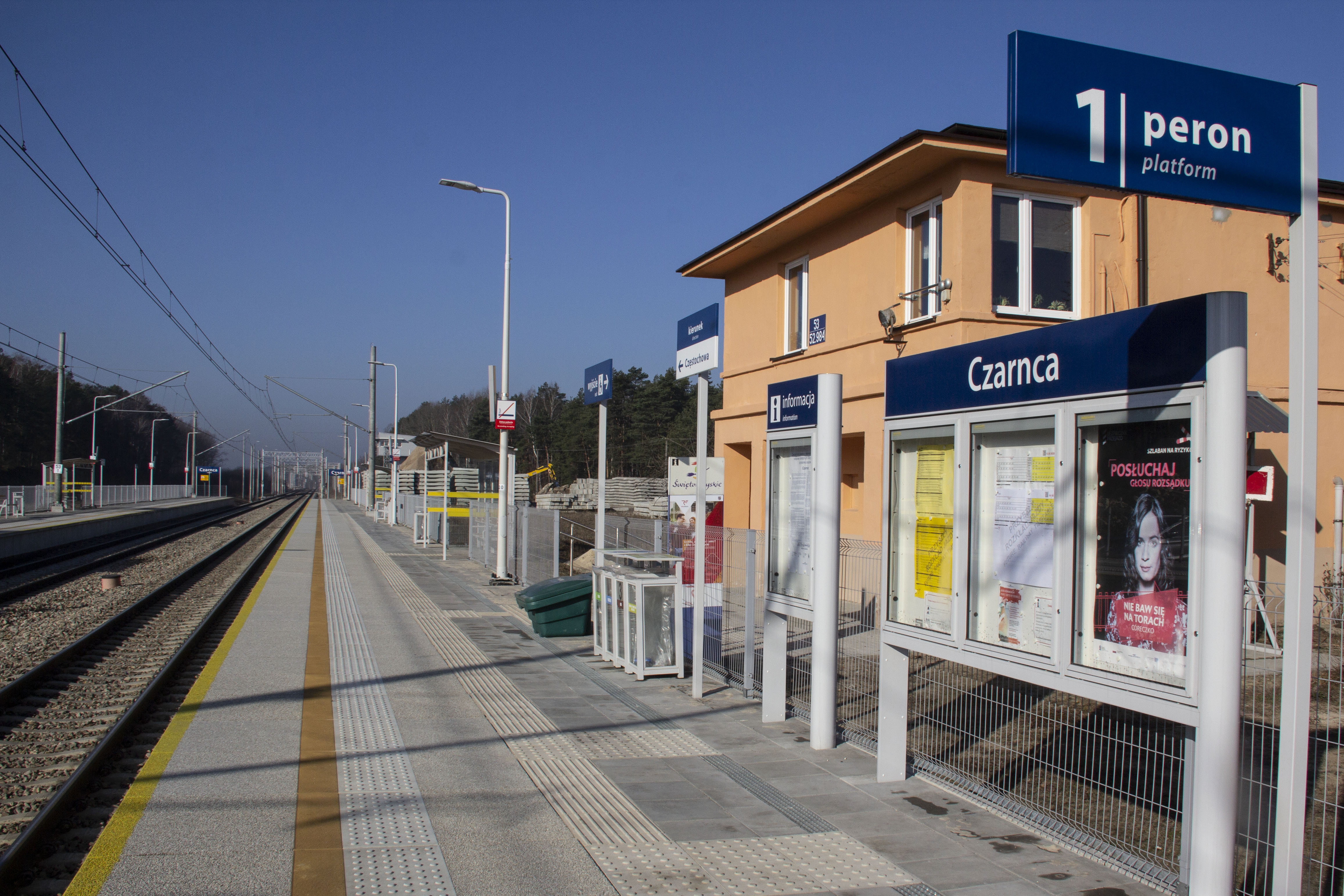PLK-2021-04-12-Z-przystanku-Wierna-Rzeka-wygodniej-pojedziemy-do-Kielc-i-Czestochowy-peron-na-przystanku-Czarnca-wraz-z-tablica-z-nazwa-po-prawej-budynek-w-tle-tory-kolejowe-fot.jpg