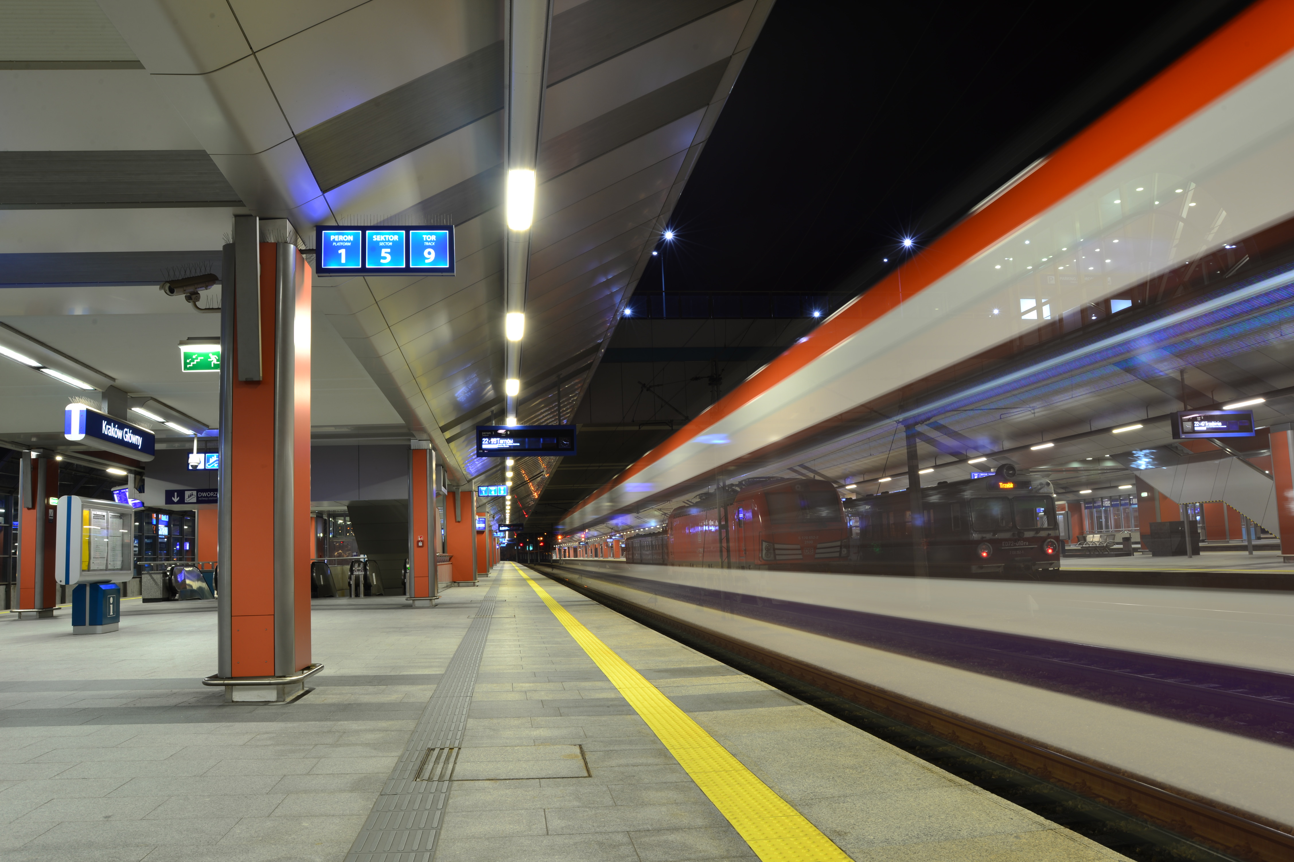 Zdjęcia dworca Kraków Główny wykonane nocą. Fotografie powstały we wrześniu 2015 r.