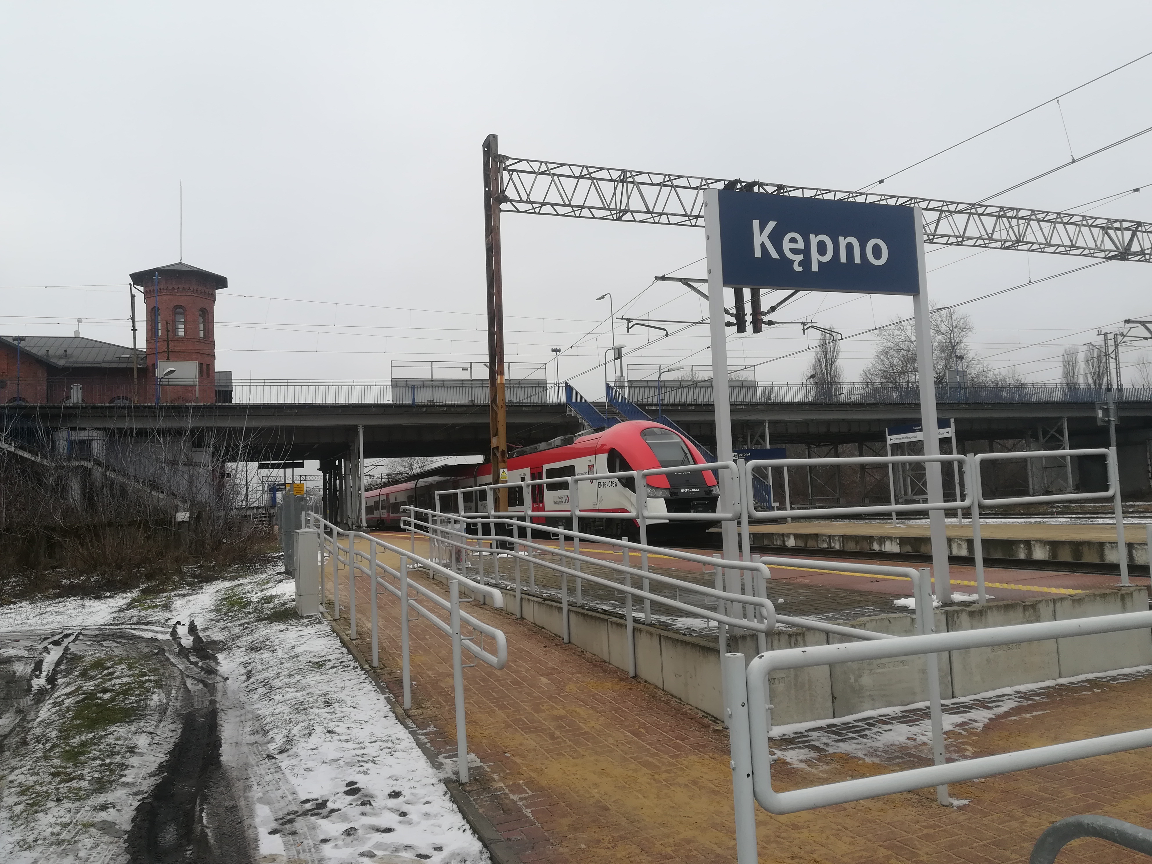 PLK-2022-01-27-Podrozni-w-Kepnie-zyskaja-windy-i-nowy-peron-PLK-zwiekszaja-dostep-do-kolei-Pochylnia-prowadzaca-na-peron-stacji-Kepno-tablica-z-nazwa-stacji-w-tle-pociag-i-widok-na-gorny-poziom-stacji-fot.jpg