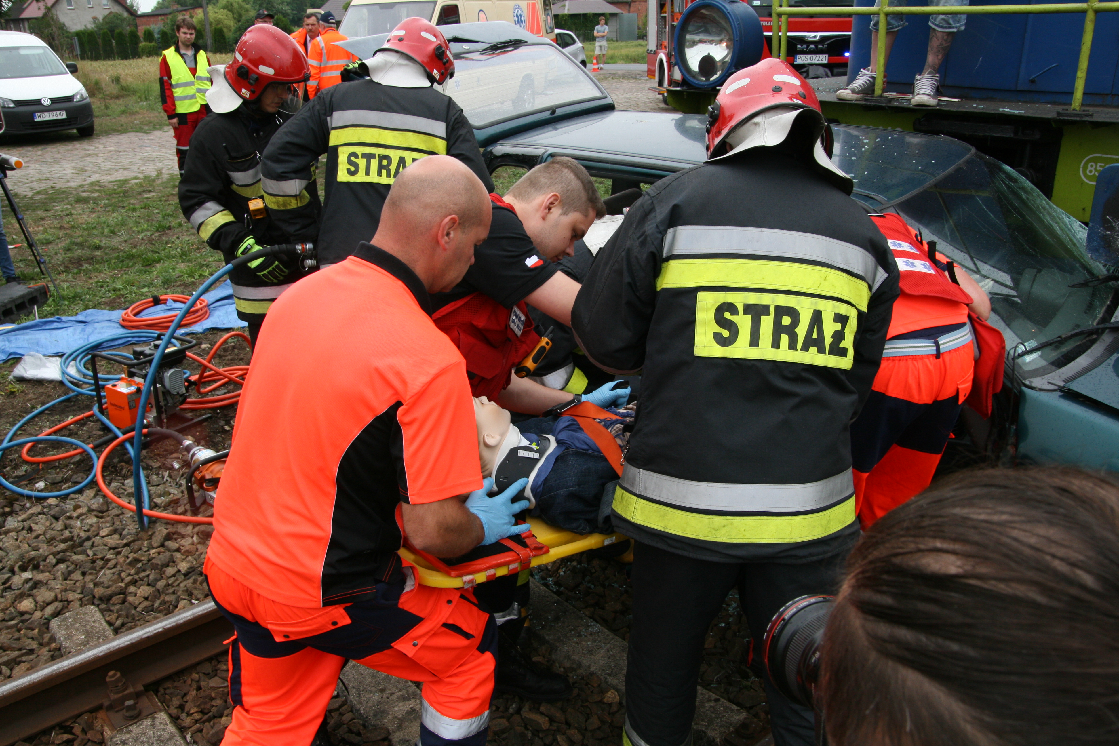 Symulacja zderzenia lokomotywy z samochodem na przejeździe kolejowo-drogowym w miejscowości Czeluścin