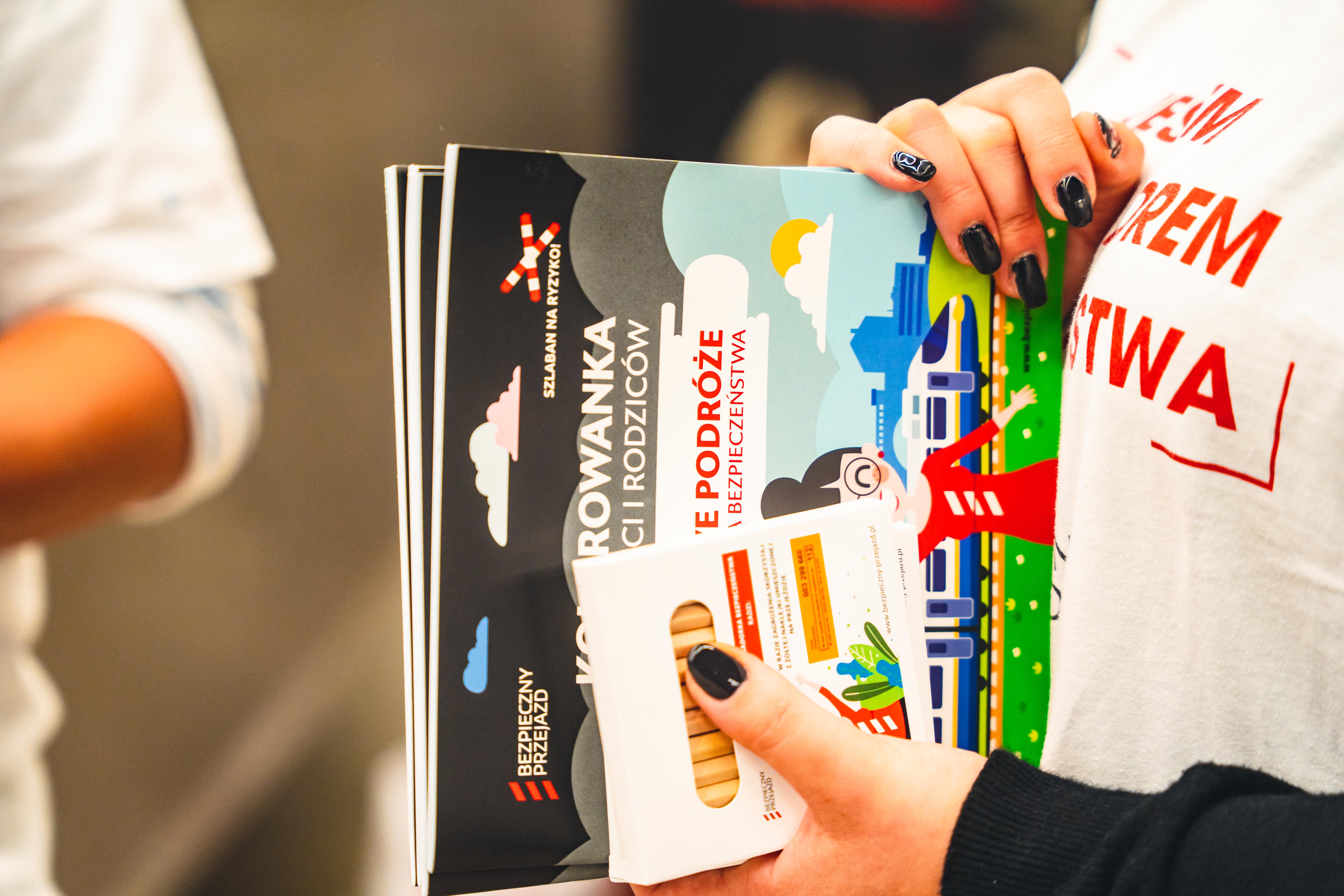 Stoisko kampanii społecznej "Bezpieczny Przejazd" w trakcie przejazdu pociągu europejskiego (Connecting Europe Express) na stacji Warszawa Centralna.