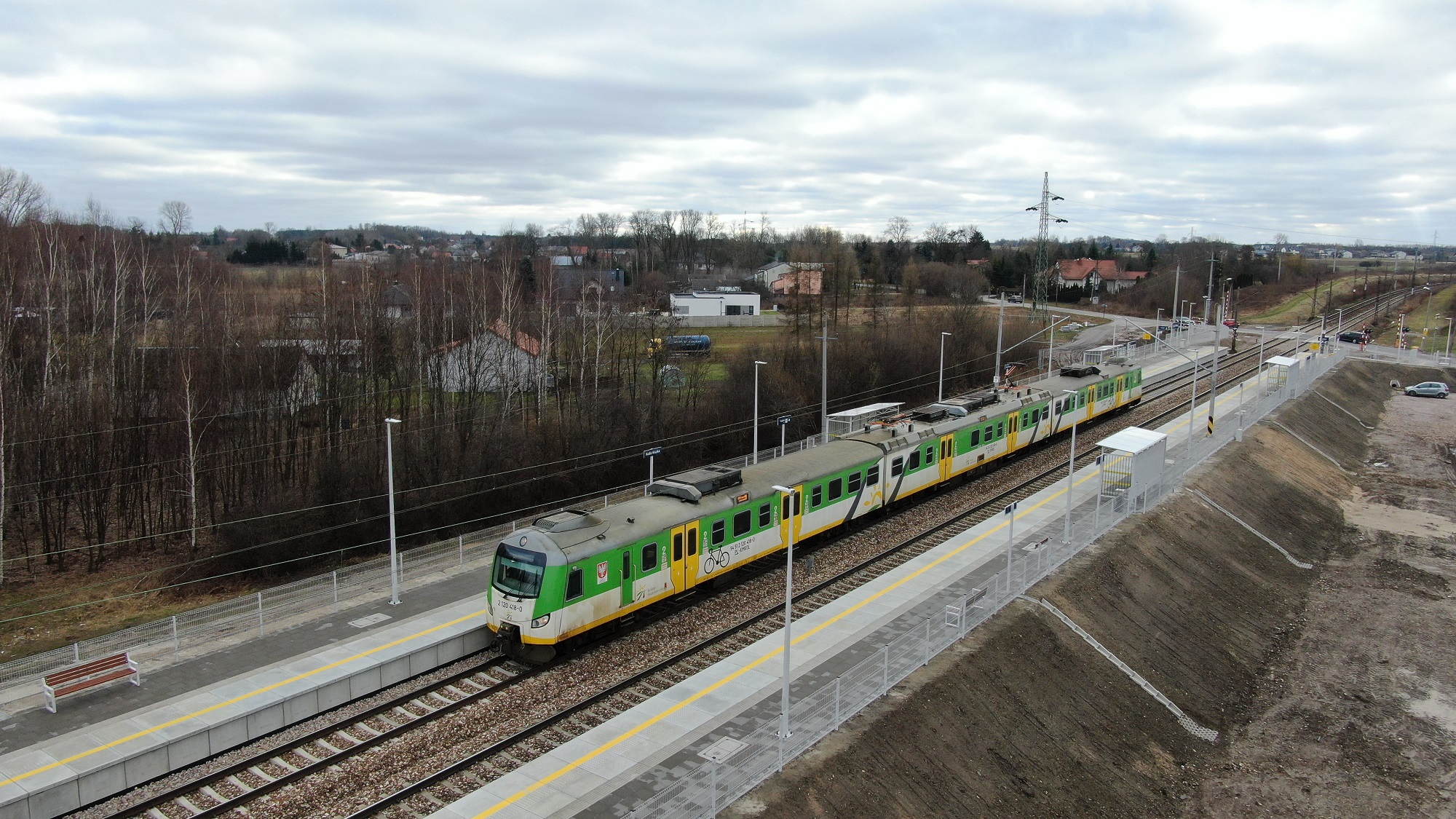 PLK-2024-04-19-Nowe-parkingi-przy-stacjach-i-przystankach-miedzy-Warszawa-a-Radomiem-Widok-z-gory-na-przystanek-w-Rudzie-Wielkiej-widac-pociag-przy-peronie-fot.jpg