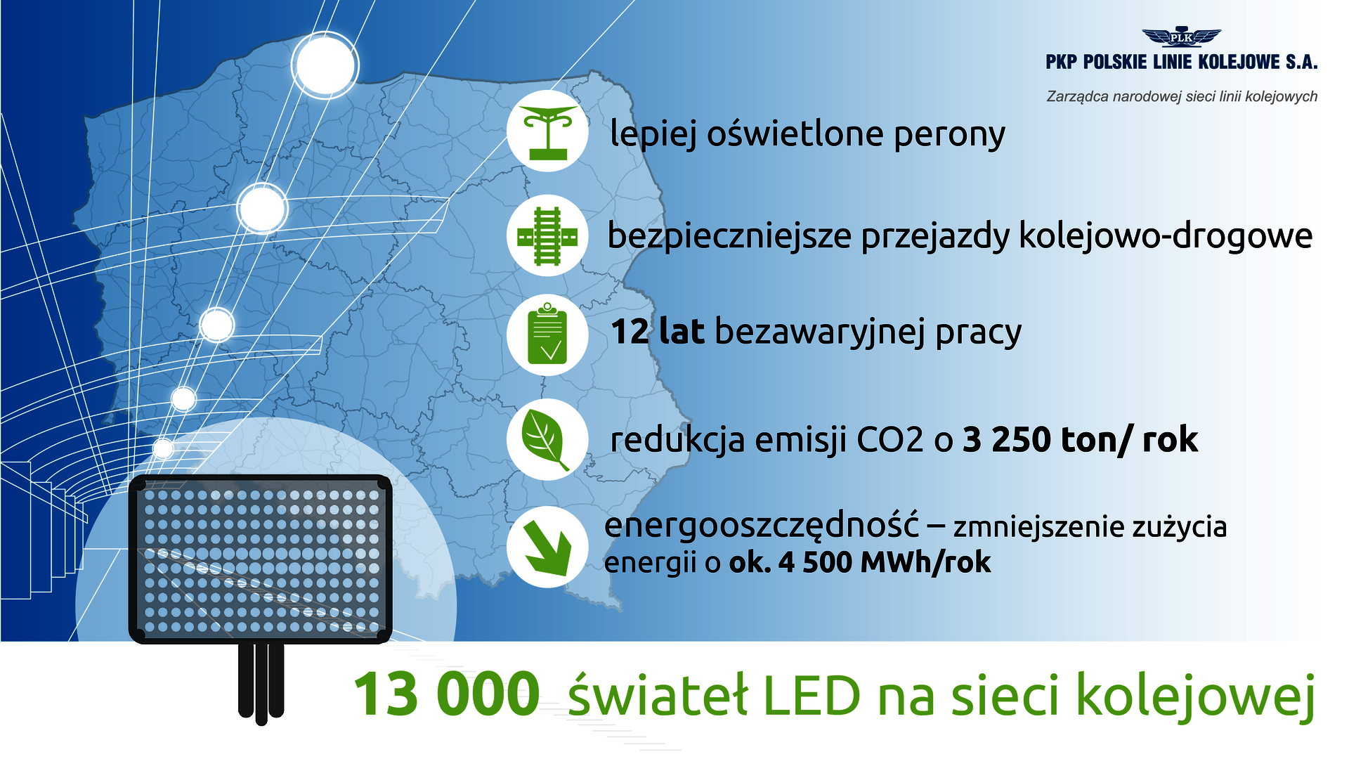 Dla podróżnych jasne światło LED zwiększa poczucie bezpieczeństwa i komfort. Korzyści z „nowego” światła na peronach, przejazdach kolejowo-drogowych i przejściach to mniejsze zużycie energii elektrycznej, ograniczenie emisji CO2 , dłuższa praca. PKP Polskie Linie Kolejowe S.A. wymieniły ponad 1000 lamp na LED tylko w bieżących pracach w 2020 r. Działania wpisują się w ideę Europejskiego Zielonego Ładu.