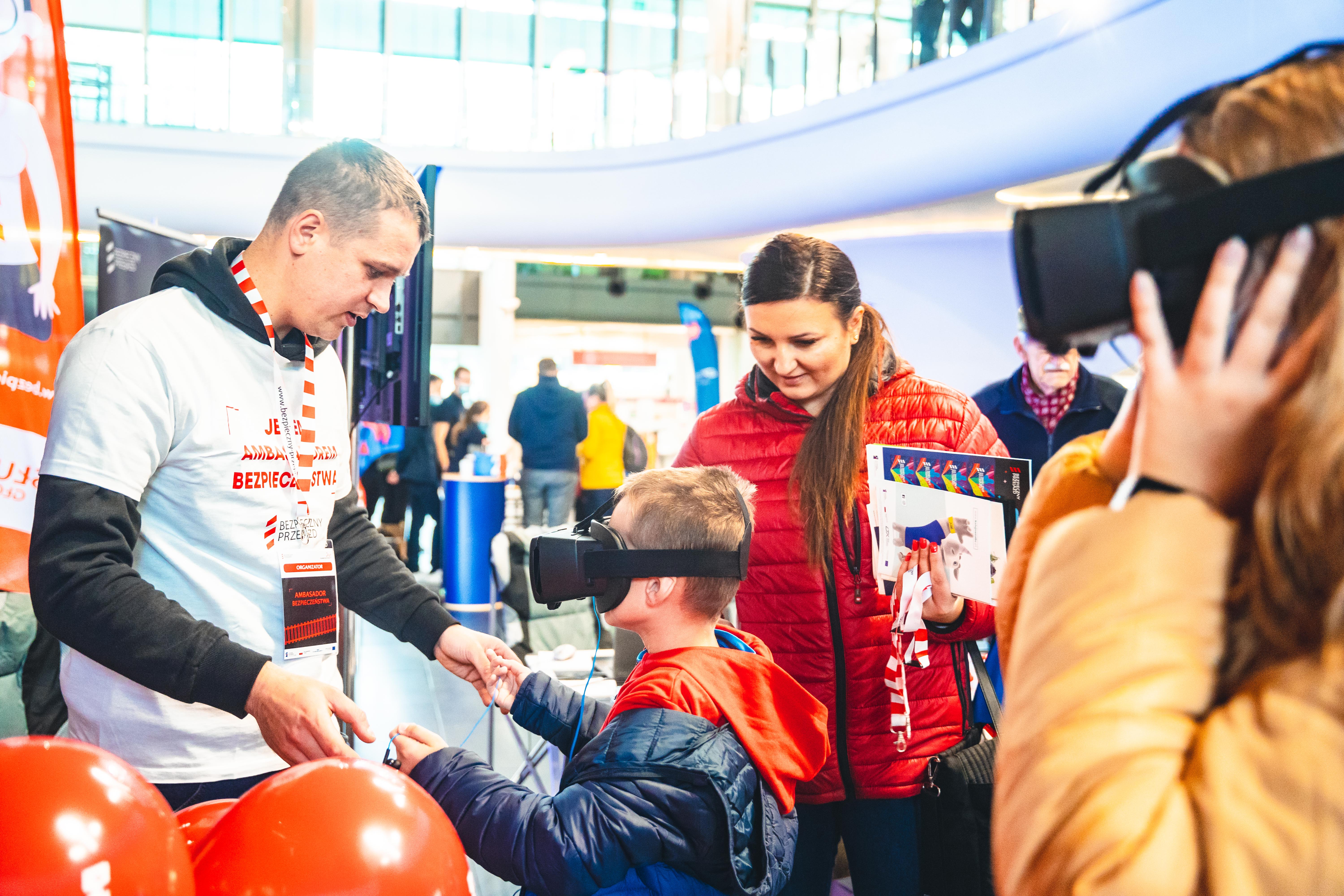 Stoisko kampanii społecznej "Bezpieczny Przejazd" w trakcie przejazdu pociągu europejskiego (Connecting Europe Express) na stacji Warszawa Centralna.