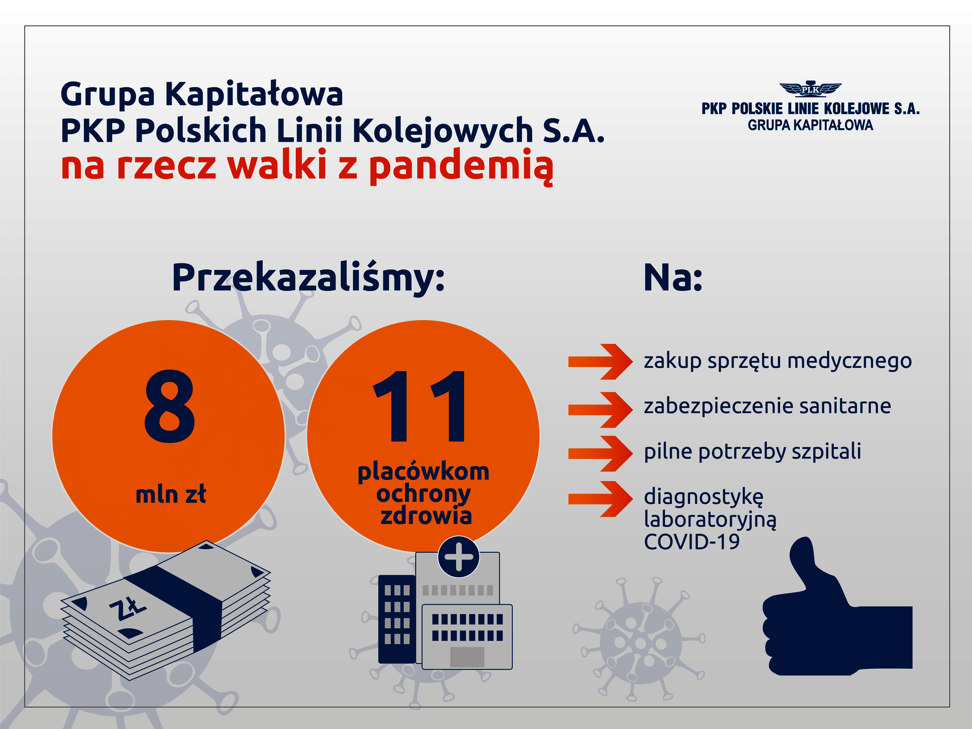 Kolejne środki na walkę z koronawirusem przekazały PKP Polskie Linie Kolejowe S.A. oraz spółki zależne PPMT i DOLKOM. Ponad 657 tys. zł na zakup urządzeń medycznych otrzymały: Samodzielny Publiczny Zakład Opieki Zdrowotnej w Parczewie, Szpitale Pomorskie Sp. z o.o. oraz Samodzielny Publiczny Wielospecjalistyczny Zakład Opieki Zdrowotnej MSWiA w Bydgoszczy. Grupa Kapitałowa PLK skierowała już blisko 8 mln zł pomocy na zakup sprzętu, środków i pilne potrzeby szpitali.