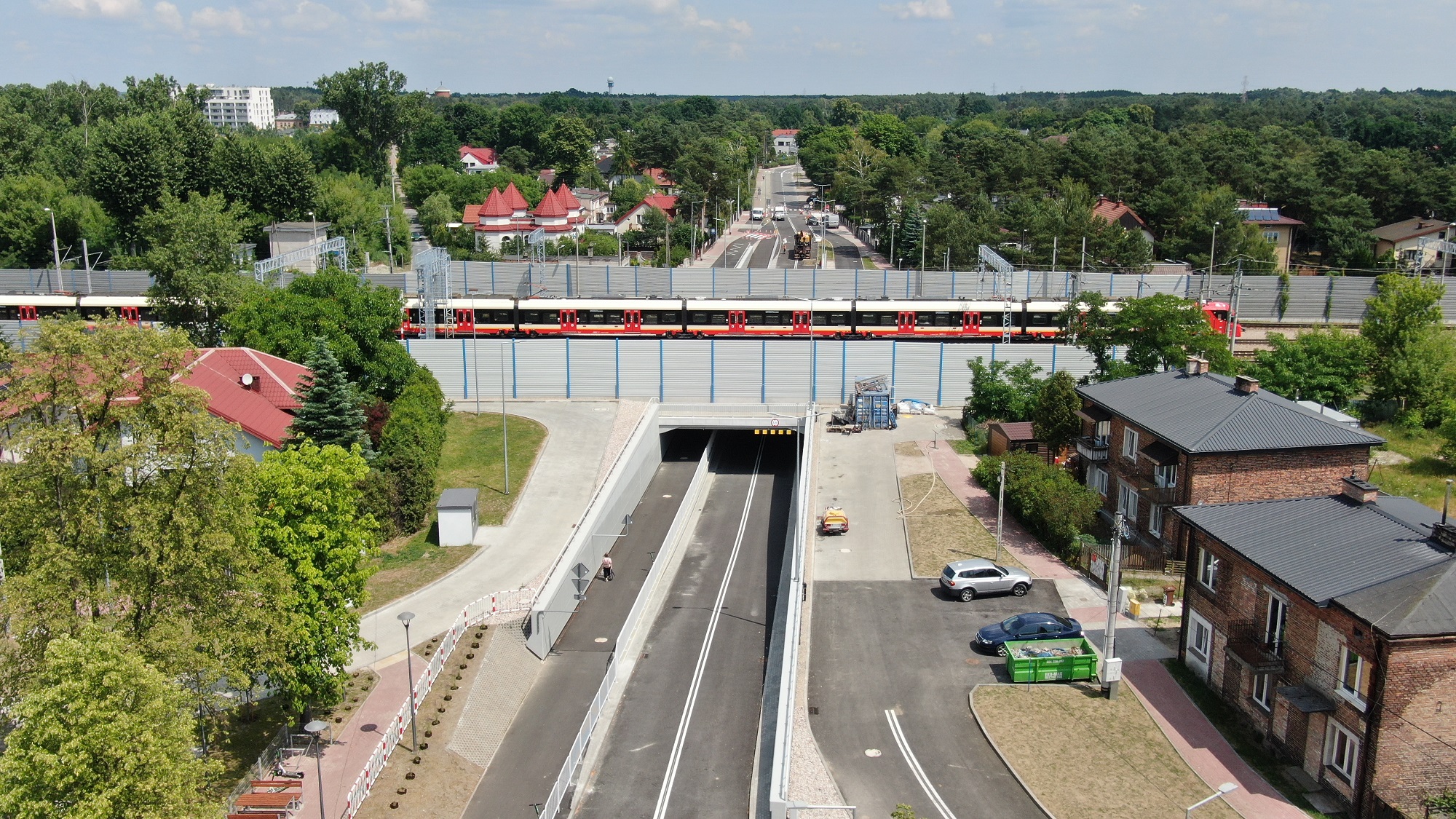 PLK-2023-07-06-Nowa-przeprawa-pod-torami-w-Legionowie-Widok-z-gory-na-nowy-tunel-pod-torami-w-Legionowie-widac-tory-przejezdzajacy-pociag-i-nowe-drogi-dojazdu-do-tunelu-fot.jpg