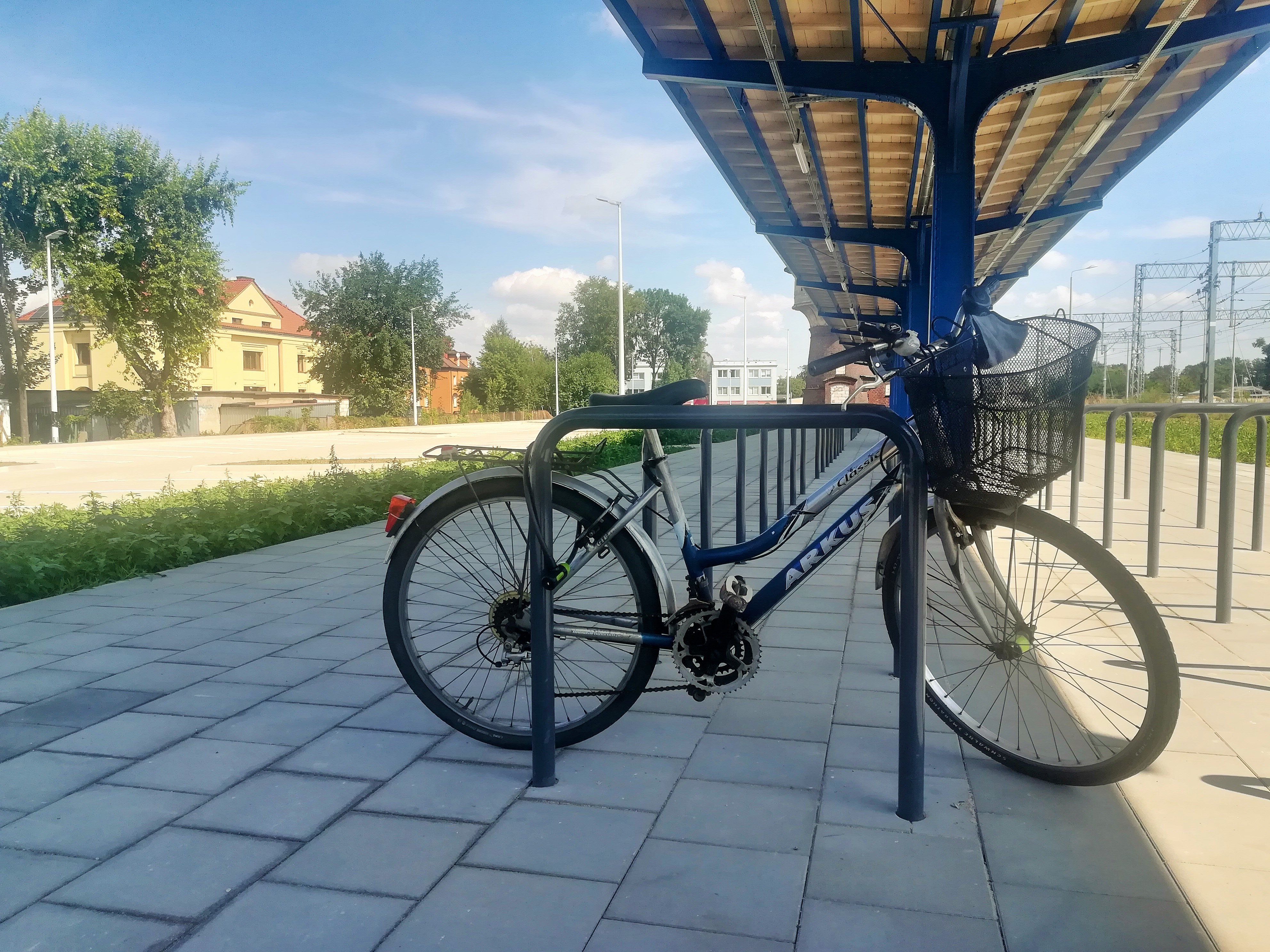 PLK-2021-08-13-Koscian-kolej-z-nowa-oferta-dla-kierowcow-i-rowerzystow-Rower-przypiety-do-stojaka-na-parkingu-przy-stacji-kolejowej-w-Koscianie-fot.jpg