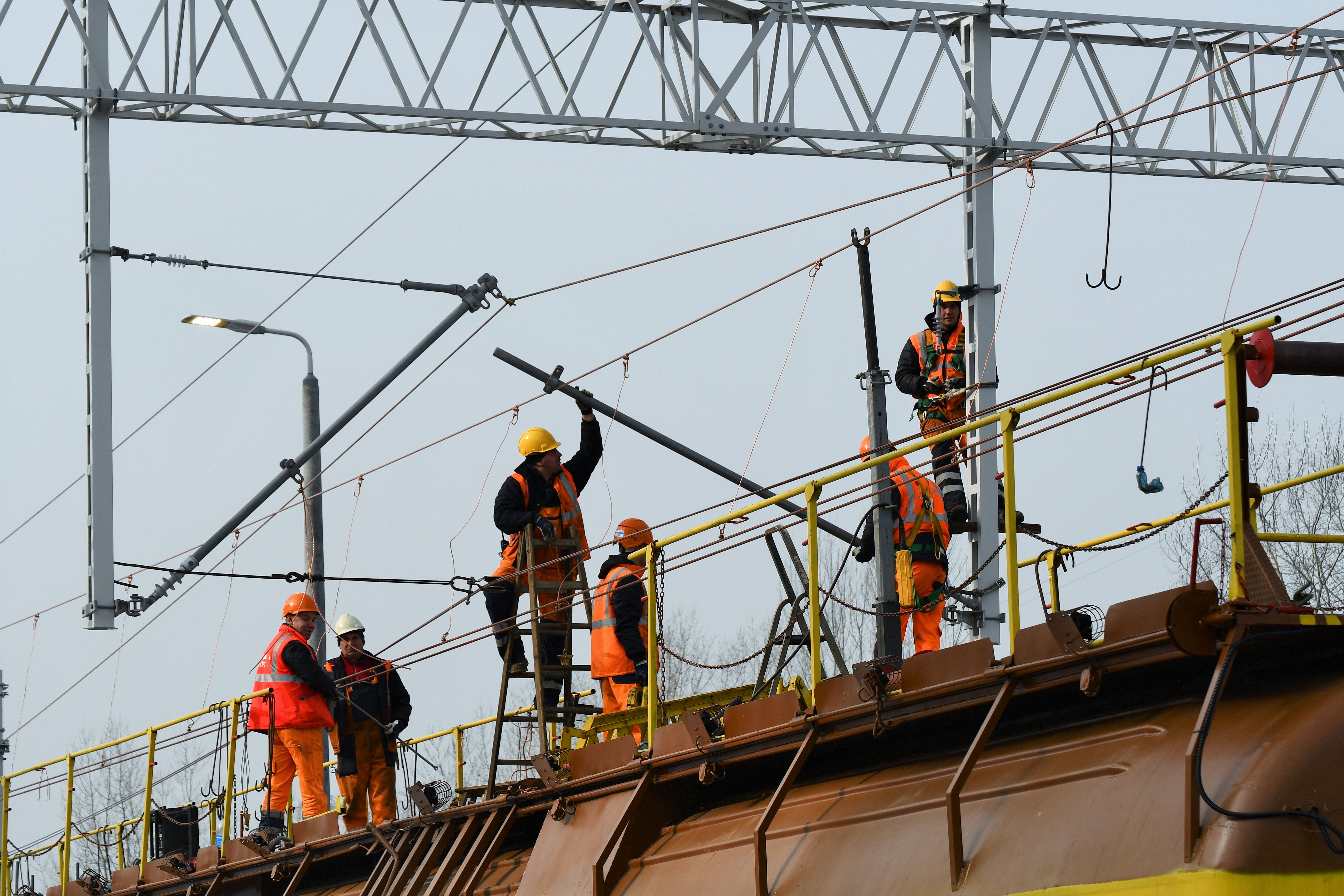 Postęp prac przy odbudowie Warszawy Głównej. Montaż sieci trakcyjnej. Budowa wejścia na kładkę od strony dzielnicy Ochota.