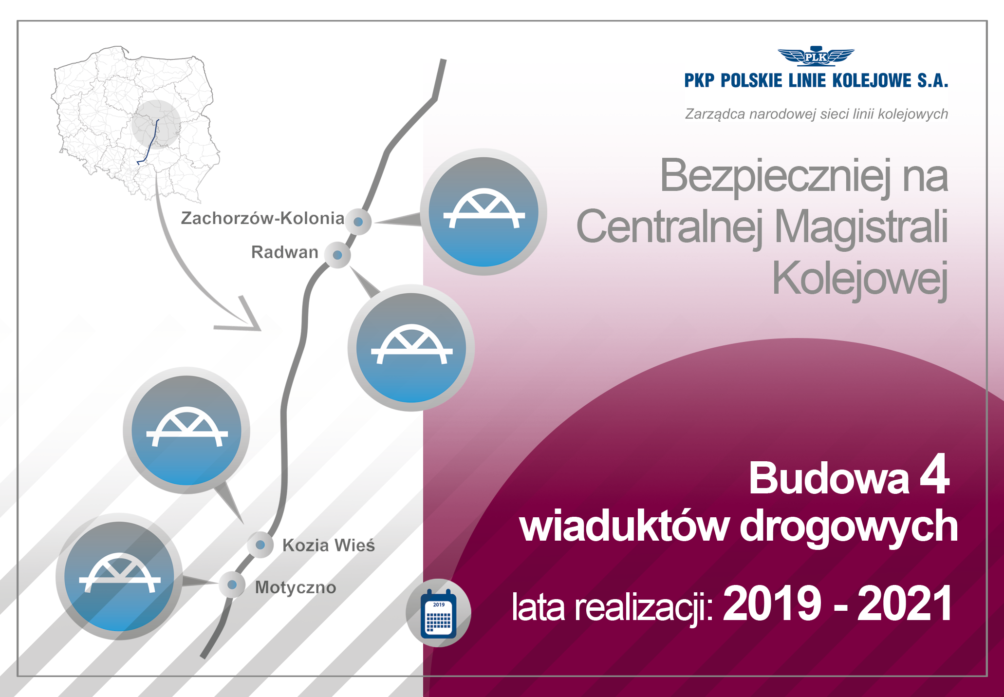 Obok kursujących Centralną Magistralą Kolejową pociągów budowane są nowe wiadukty w Koziej Wsi i Motycznie (świętokrzyskie) oraz w Zachorzowie Kolonii i Radwanie (woj. łódzkie) Obiekty zwiększą poziom bezpieczeństwa i pozwolą na podniesienie prędkości pociągów m. in. z Warszawy do Krakowa i Katowic. Inwestycje PKP Polskich Linii Kolejowych S.A. za ponad 104 mln zł netto, przygotowują CMK do prędkości powyżej 200 km/h.
