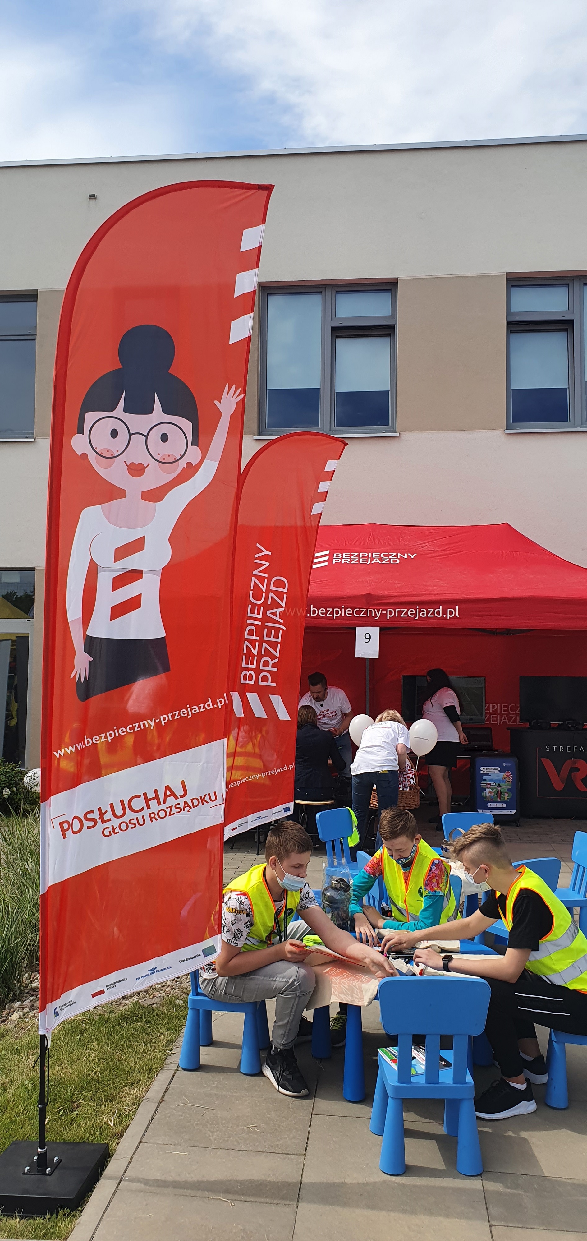 Stoisko plenerowe kampanii społecznej "Bezpieczny przejazd" zorganizowane 1 czerwca 2021 r. Kampania wzbogaciła się o kolejnych Ambasadorów Bezpieczeństwa podczas obchodów Dnia Dziecka z udziałem Prezesa Rady Ministrów RP w szkole w Bielisze (koło Radomia).