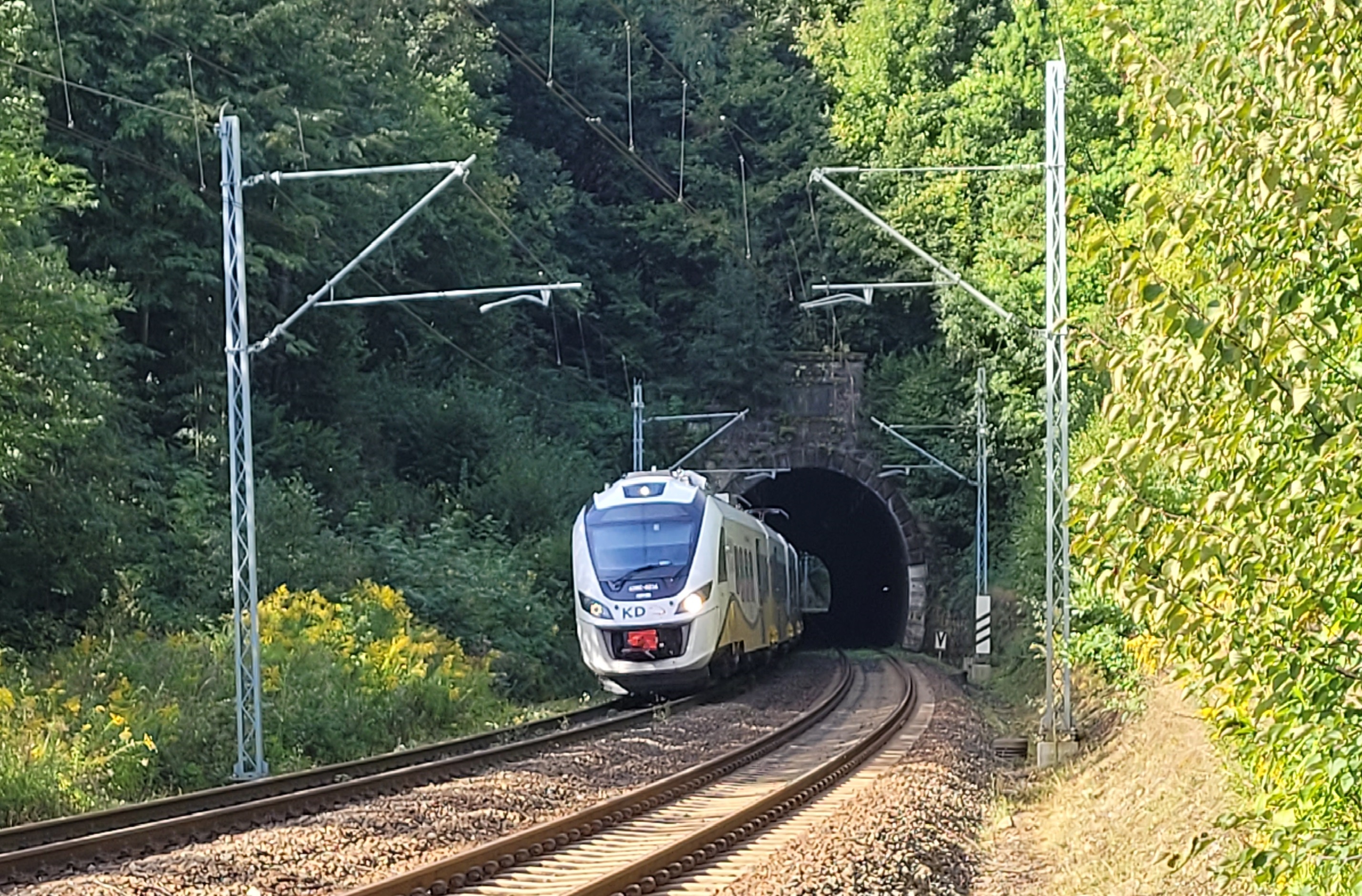 PLK-2022-09-08-Sprawne-podroze-na-trasie-Wroclaw-Jelenia-Gora-przebudowa-tunelu-nowa-technologia-Tunel-w-poblizu-Trzcinska-pociag-Kolei-Dolnoslaskich-wyjezdza-z-tunelu-fot.jpg