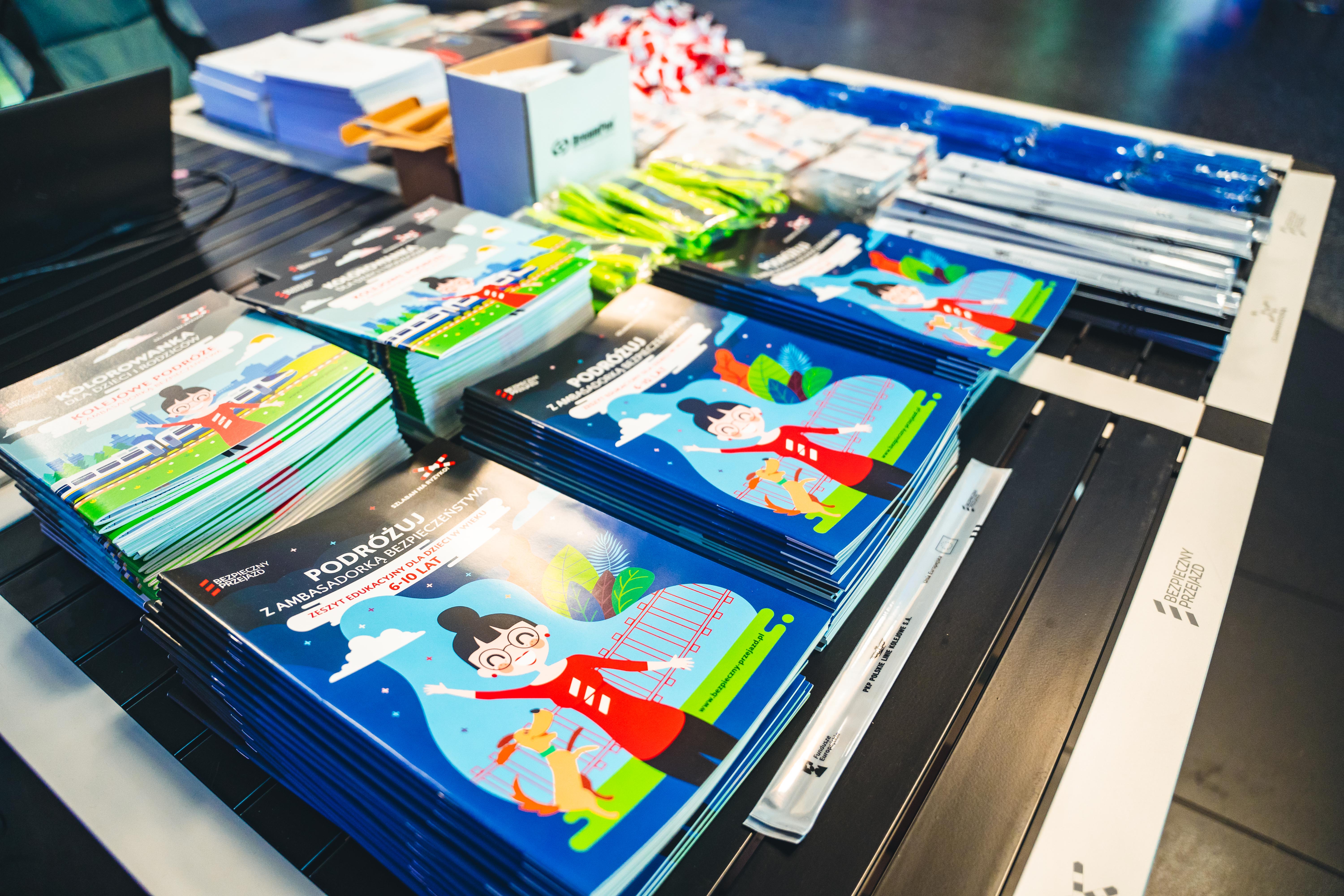 Stoisko kampanii społecznej "Bezpieczny Przejazd" w trakcie przejazdu pociągu europejskiego (Connecting Europe Express) na stacji Warszawa Centralna.