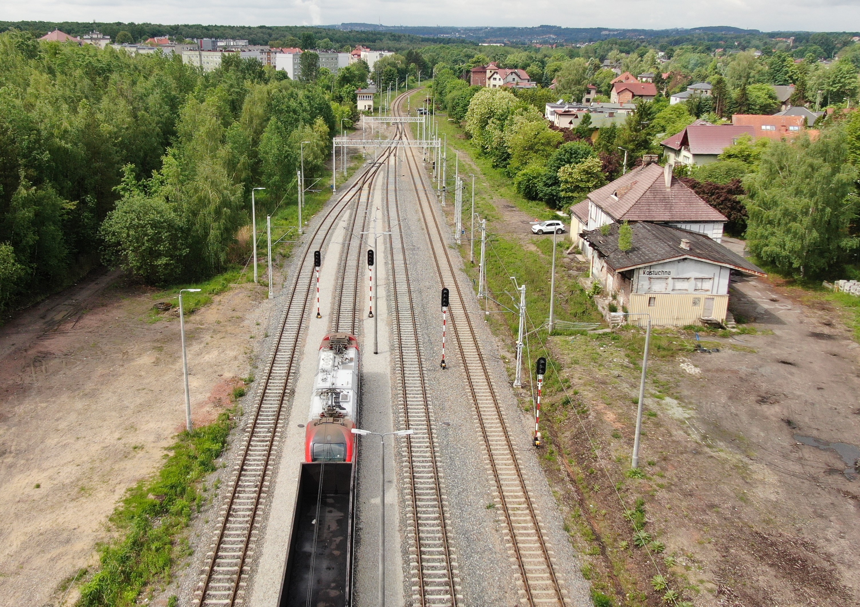 PLK-2022-08-01-Nowe-przystanki-na-poludniu-Katowic-zwieksza-dostep-do-kolei-Pociag-na-torach-w-Katowicach-Kostuchnie-widok-z-lotu-ptaka-fot.jpg