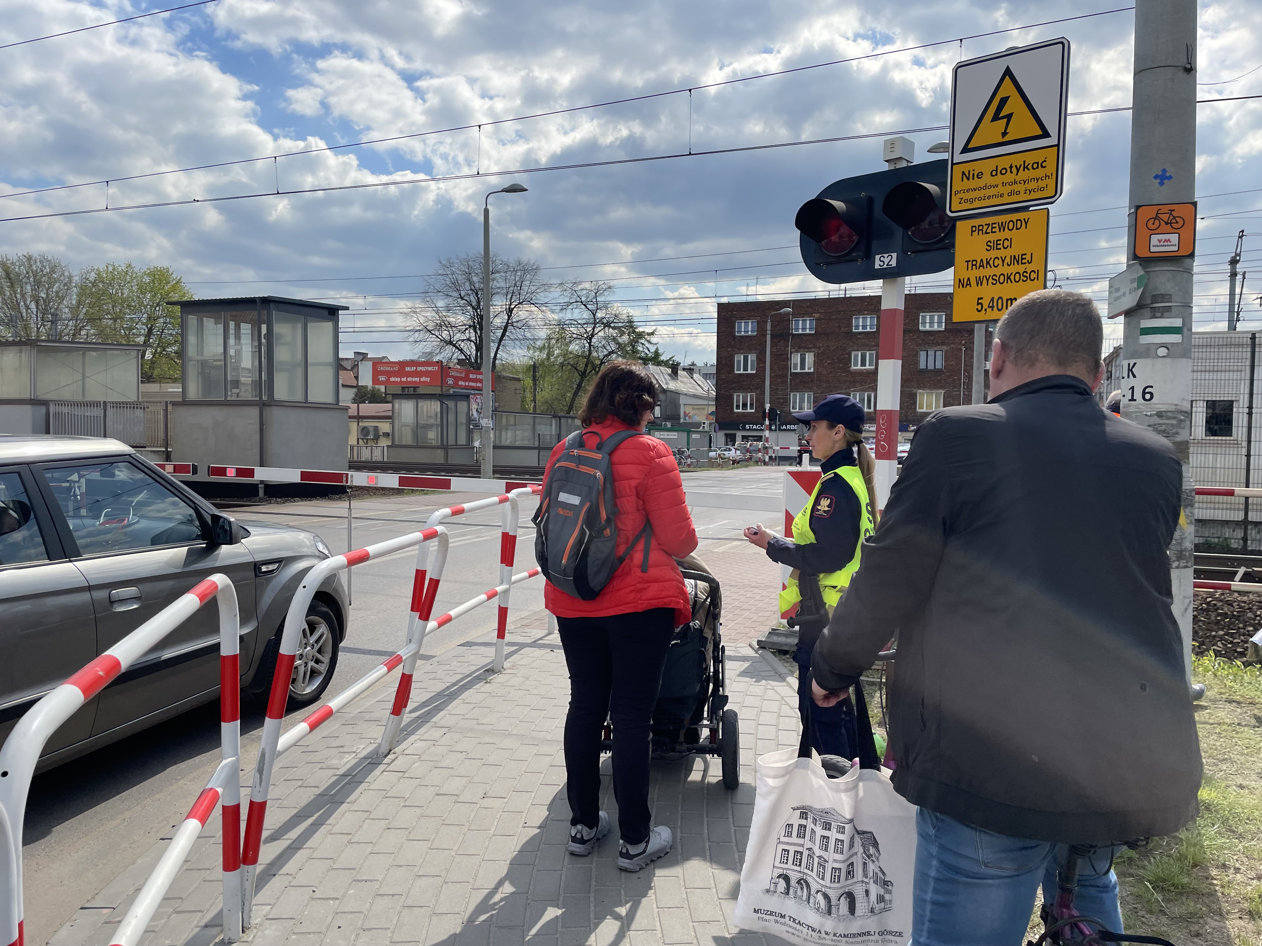 PLK-2023-04-28-Kolejarze-apeluja-o-bezpieczenstwo-na-przejazdach-w-drodze-na-majowke-Przedstawicielka-SOK-rozmawia-z-piesza-przy-przejezdzie-kolejowo-drogowym-w-Kobylce-fot.jpg