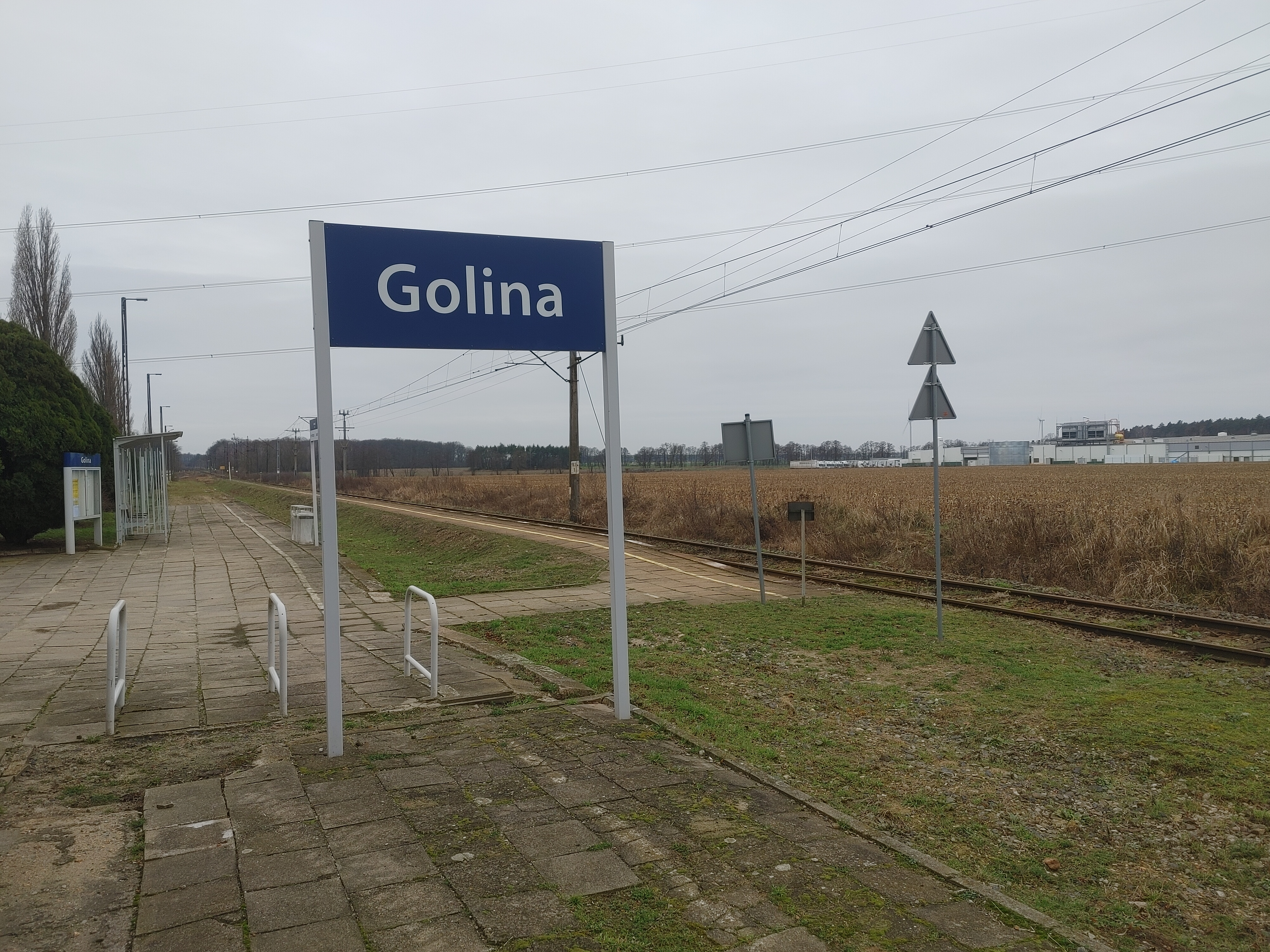PLK-2023-01-12-PLK-SA-zwieksza-komfort-podrozy-na-poludniu-Wielkopolski-Tablica-z-nazwa-przystanku-Golina-stojaki-rowerowe-tor-i-siec-trakcyjna-fot.jpg