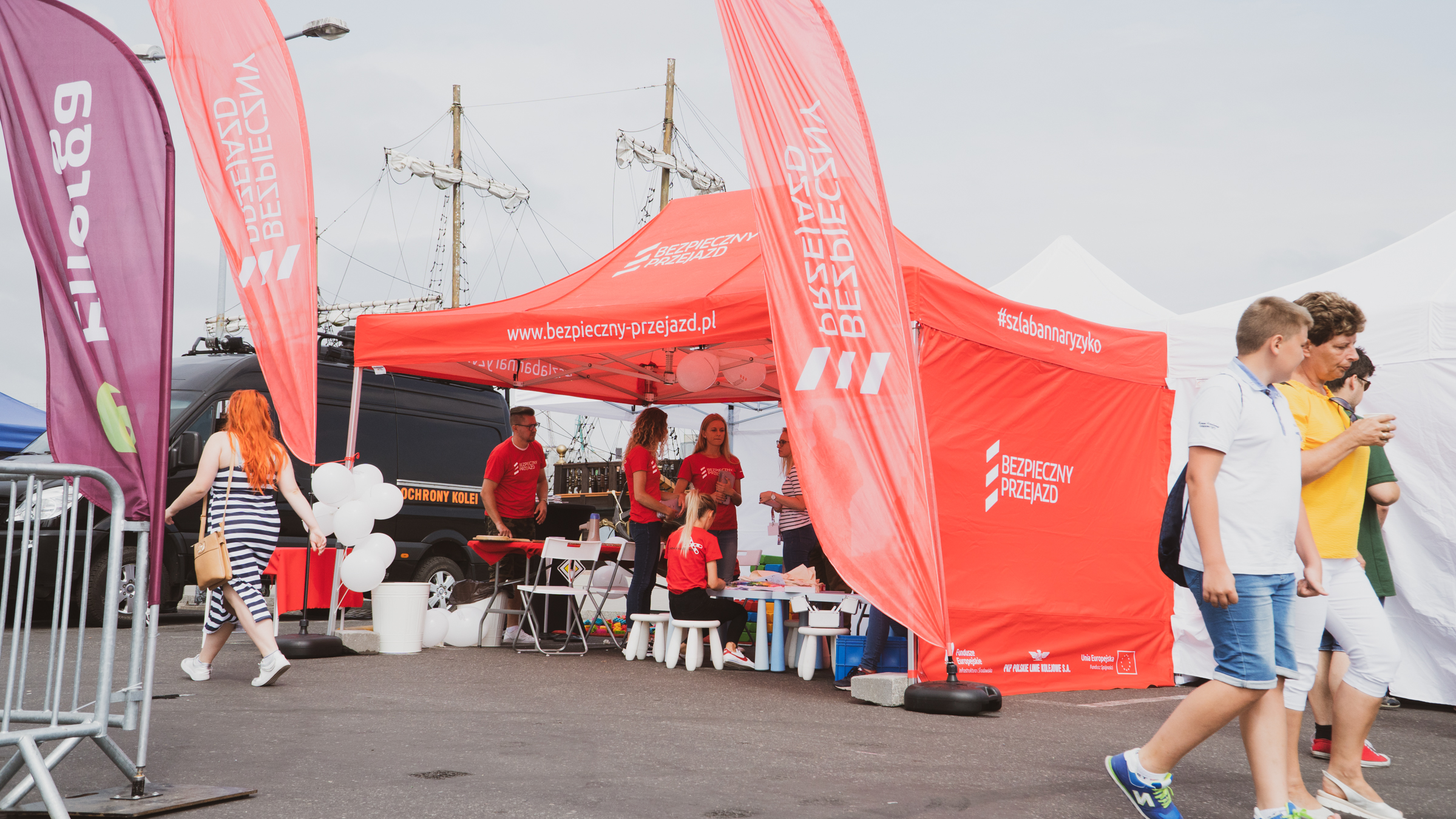 Stoisko promocyjne kampanii społecznej "Bezpieczny przejazd..." na Moto Safety Day, organizowanym w Gdyni 27 lipca 2019 r.