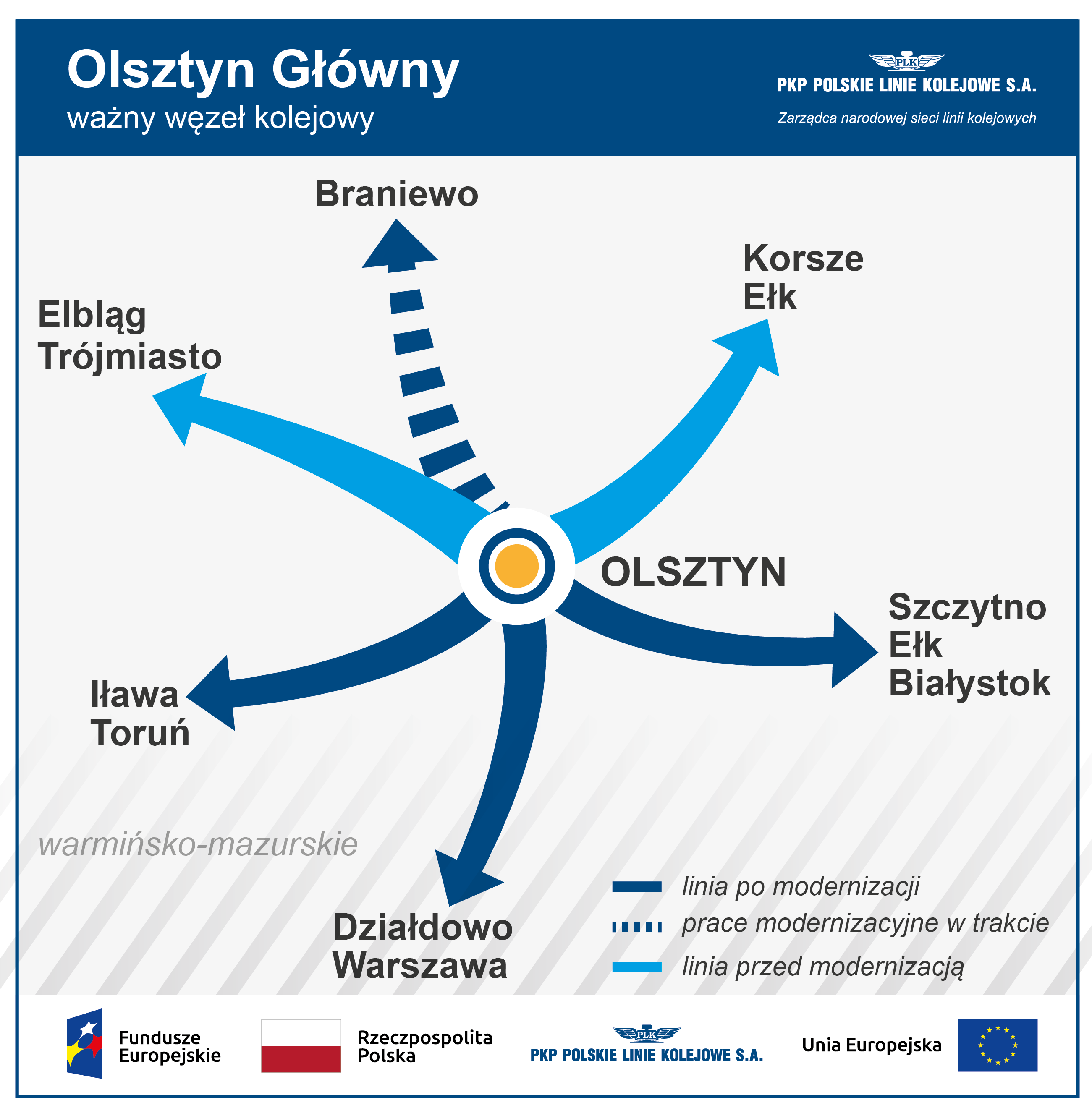 Będą wygodniejsze podróże ze stacji Olsztyn Główny. PKP Polskie Linie Kolejowe S.A. podpisały umowę wartą prawie 400 mln zł na przebudowę peronów, torów i przejścia podziemnego. Dostępność zapewnią windy i schody ruchome. Powstanie stacja odpowiadająca oczekiwaniom podróżnych. Inwestycja współfinansowana jest z funduszy Unii Europejskiej, z Programu Operacyjnego Polska Wschodnia.