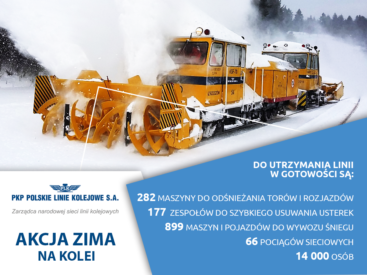 Na sieci kolejowej PKP Polskie Linie Kolejowe S.A. przygotowały ponad 280 jednostek sprzętu odśnieżnego. Bezpieczne mają być perony i dojścia. Stały monitoring pogody pozwala na szybkie reakcje zespołów technicznych i 66 pociągów do naprawy sieci trakcyjnej. W trudnych warunkach zimowych przewidziano udział nawet 14 000 pracowników.
