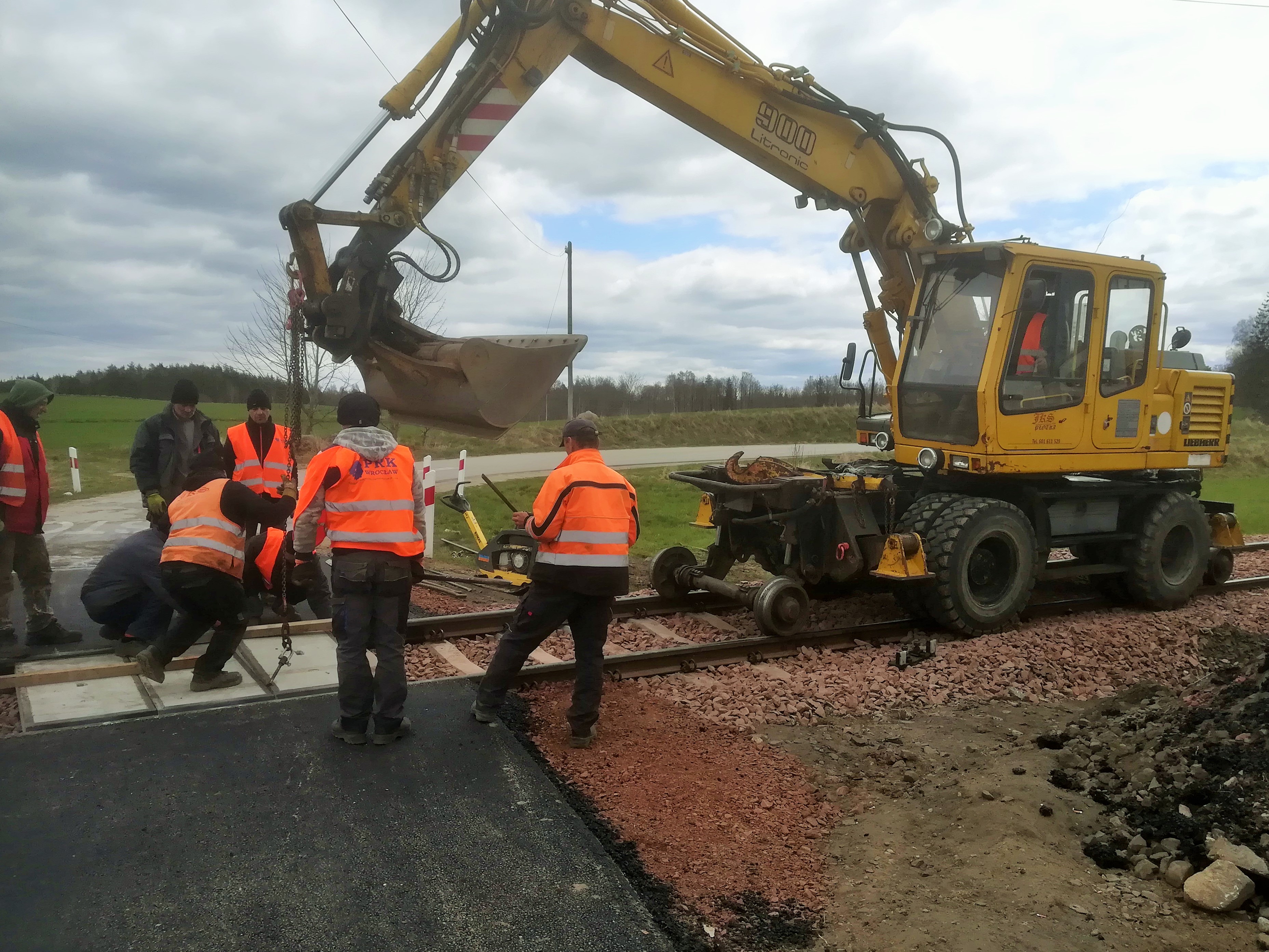 PLK-2021-04-30-Beda-lepsze-podroze-koleja-po-Kaszubach-Robotnicy-przy-pomocy-koparki-klada-nowa-nawierzchnie-na-przejezdzie-kolejowo-drogowym.jpg
