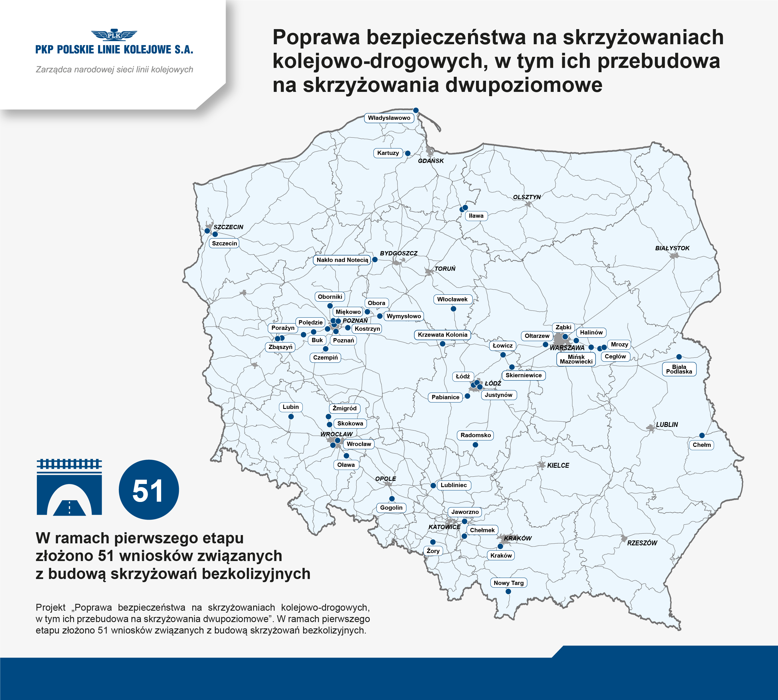 PLK SA zakończyła nabór wniosków do pierwszego etapu projektu „Poprawa bezpieczeństwa na skrzyżowaniach kolejowo-drogowych, w tym ich przebudowa na skrzyżowania dwupoziomowe”. W ramach pierwszego etapu złożono 51 wniosków związanych z budową skrzyżowań bezkolizyjnych, które zostaną poddane weryfikacji i rankingowaniu.