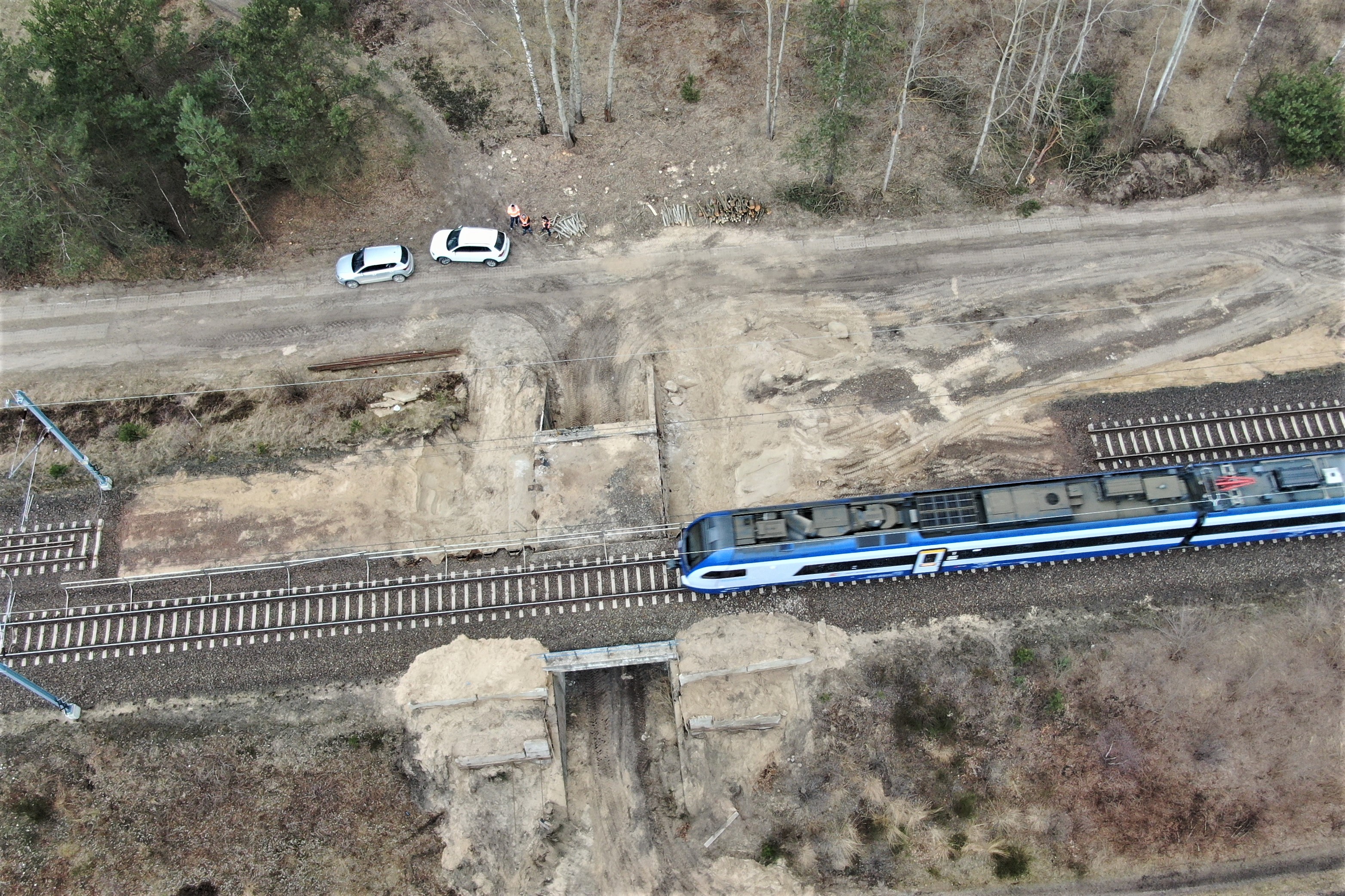 PLK-2021-03-19-CMK-w-wojewodztwie-lodzkim-ruszyla-przebudowa-mostow-i-wiaduktow-widok-z-gory-na-tory-kolejowe-i-przejezdzajacy-pociag-na-CMK-na-szlaku-Opoczno-Pld.jpg