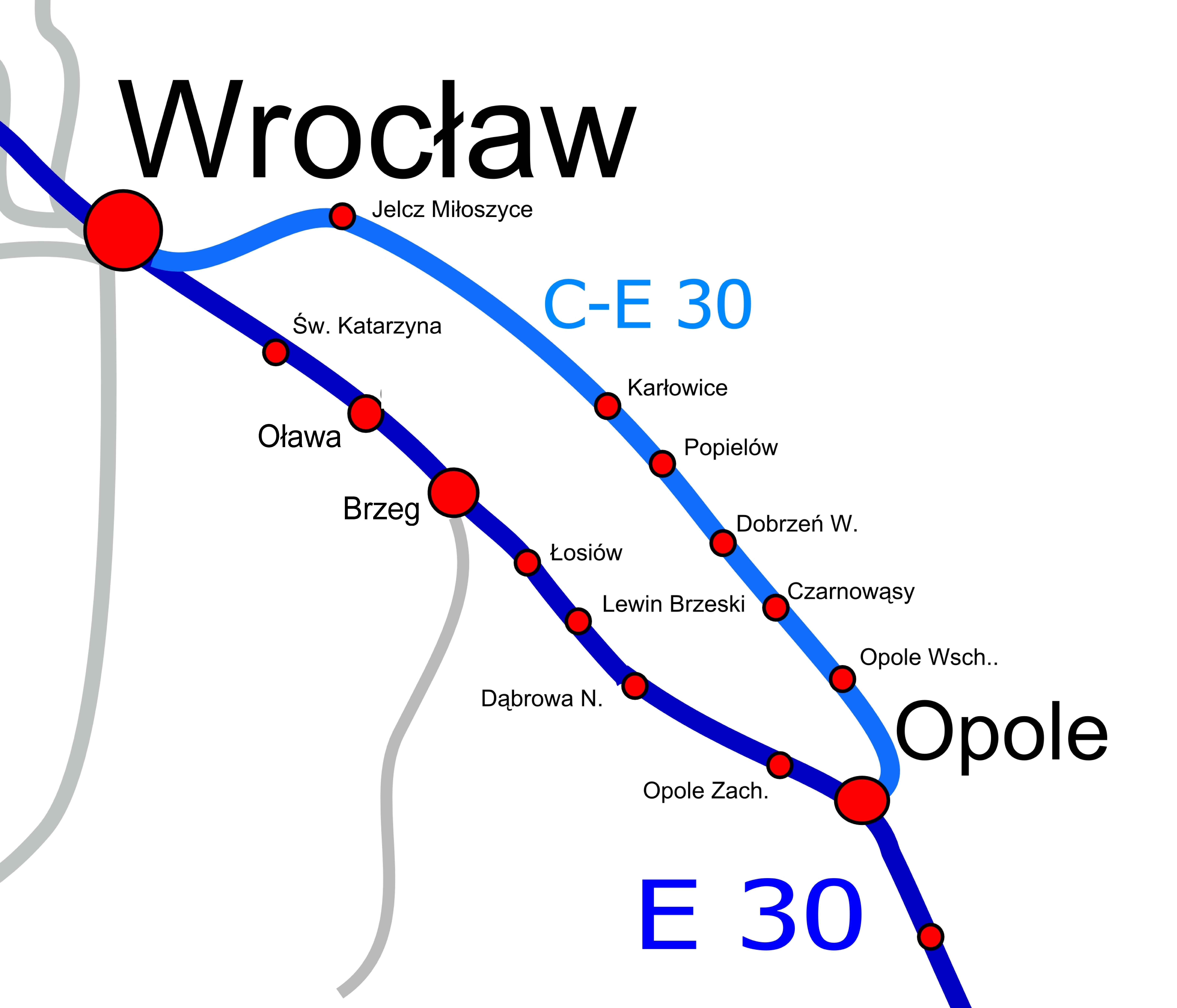 Za blisko 24 mln zł będą wykonane projekty dla przyszłych prac na linii kolejowej Wrocław – Opole przez Siechnice, Jelcz, Popielów (C-E 30). Trasa będzie zaplanowana tak, by były sprawniejsze podróże oraz efektywniejszy transport towarów koleją. Przyszła inwestycja odciąży ruch na kolejowej magistrali, łączącej Wrocław z Opolem przez Brzeg.