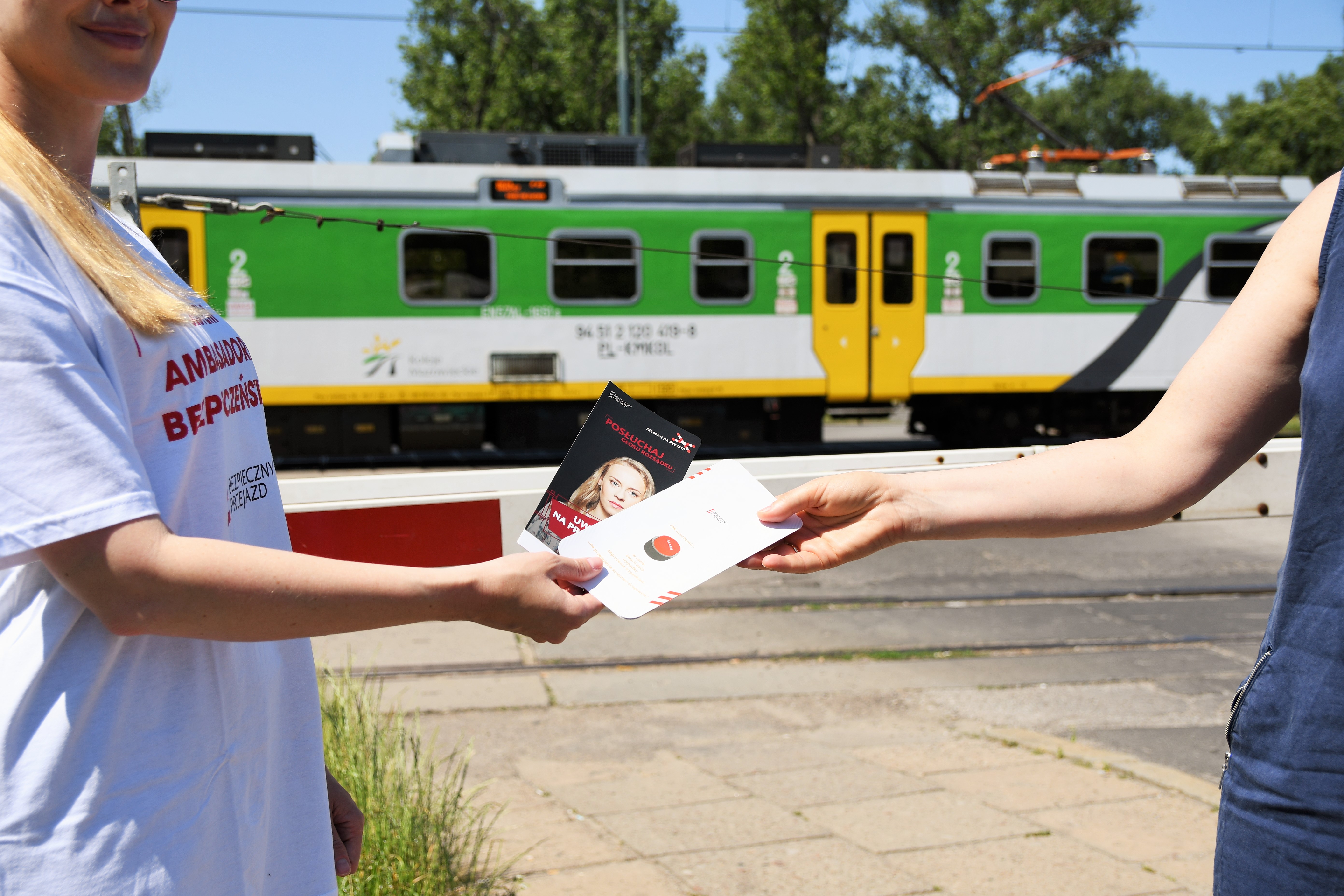 PLK-2021-Bezpieczny-piatek-Wreczanie-ulotki-z-informacjami-o-bezpieczenstwie-na-przejazdach-w-tle-pociag-regionalny-fot.jpg