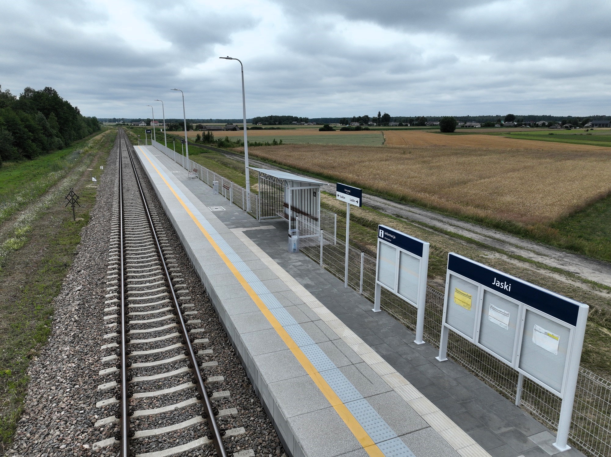PLK-2024-06-27-Dostepniejsza-i-wygodniejsza-kolej-miedzy-Lukowem-a-Lublinem-Widok-z-gory-na-peron-w-Jaskach-widac-tory-gabloty-informacyjne-wiate-fot.jpg