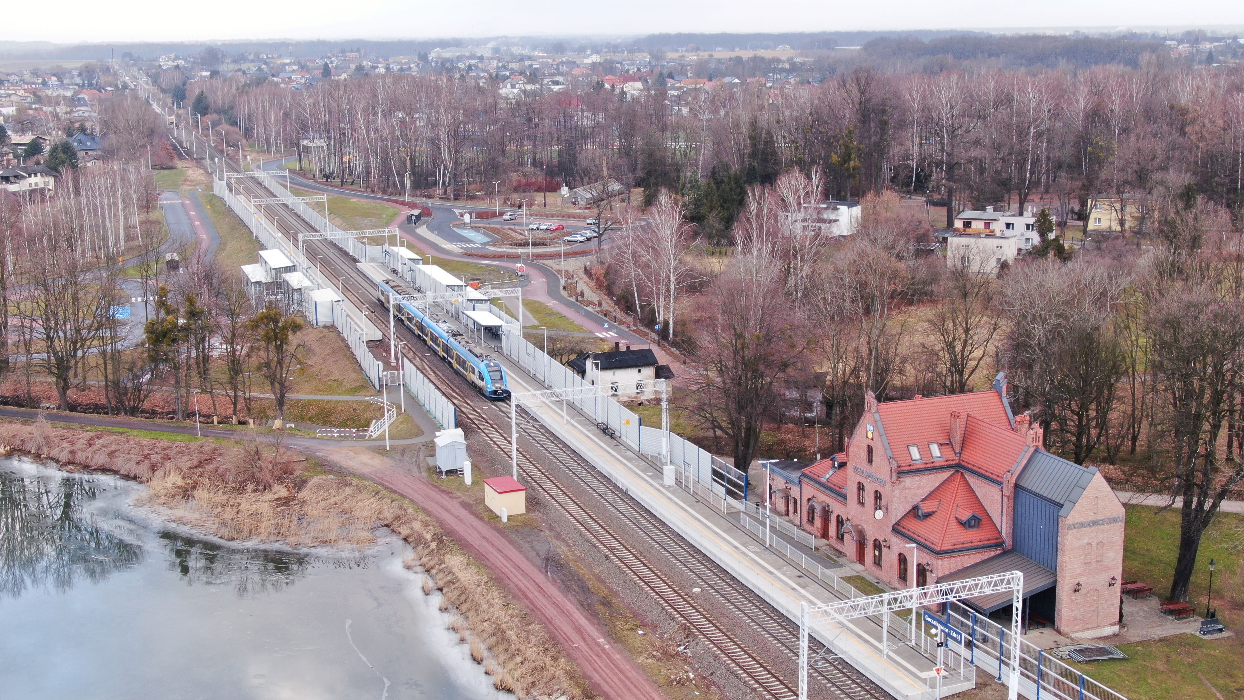 PLK-2023-03-06-Komfortowe-podroze-koleja-z-Czechowic-Dziedzic-Zabrzegu-i-Goczalkowic-Zdroju-Przystanek-Goczalkowice-Zdroj-z-lotu-ptaka-pociag-przy-peronie-fot.jpg