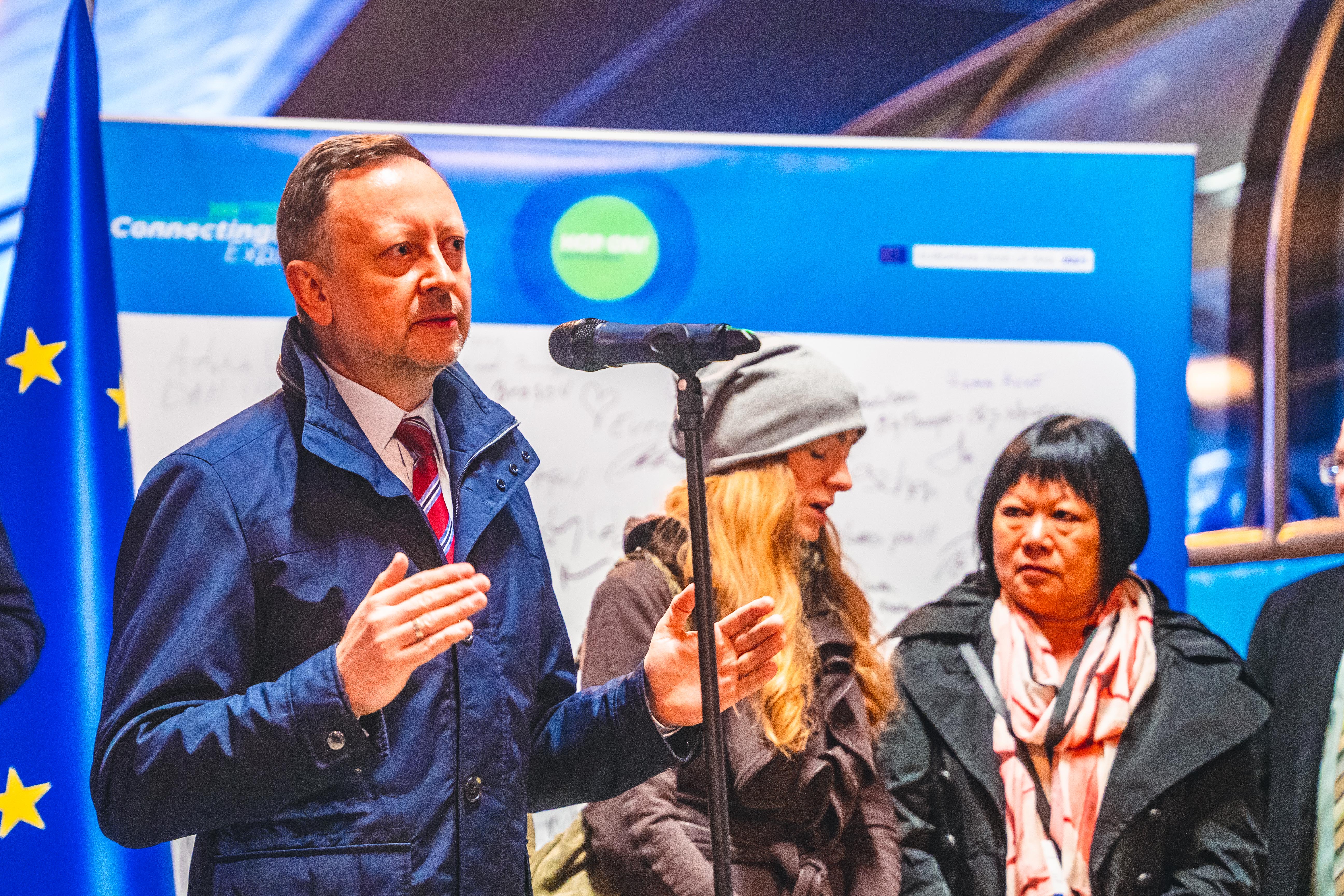 Stoisko kampanii społecznej "Bezpieczny Przejazd" w trakcie przejazdu pociągu europejskiego (Connecting Europe Express) na stacji Kraków Główny.